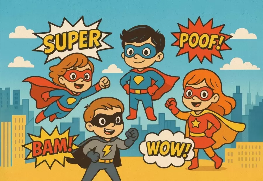 Muurschildering grappige superhelden in stripboekstijl