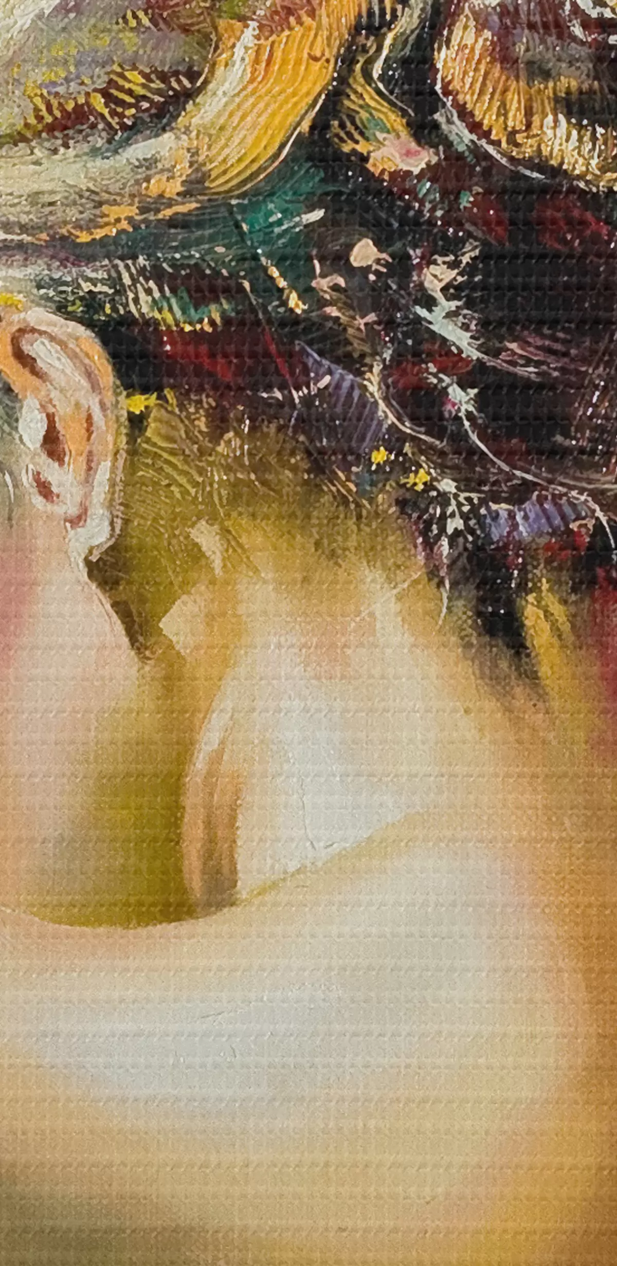 Het schilderij kan voorzichtig worden schoongeveegd met een droge zachte doek of spons; het wordt niet aanbevolen om natte producten te gebruiken. Het gebruik van een vochtige spons is alleen toegestaan als het schilderij gevernist is.