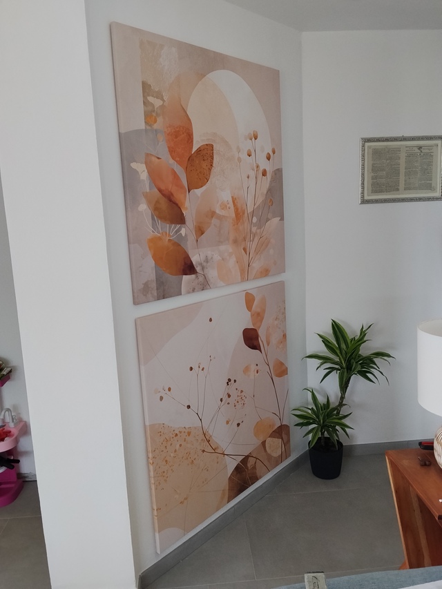 Het schilderij kan direct na ontvangst worden opgehangen. Het schilderij wordt opgespannen op een 2 cm breed houten spieraam.