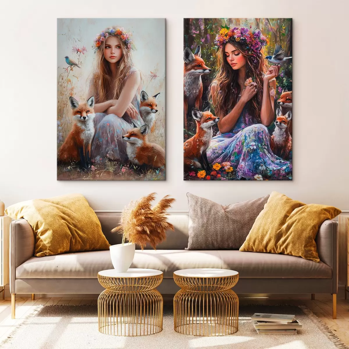 Schilderij Mooie meisjes in de wei, wilde dieren, vossen, vogels, bloemenkransen Art. m00378