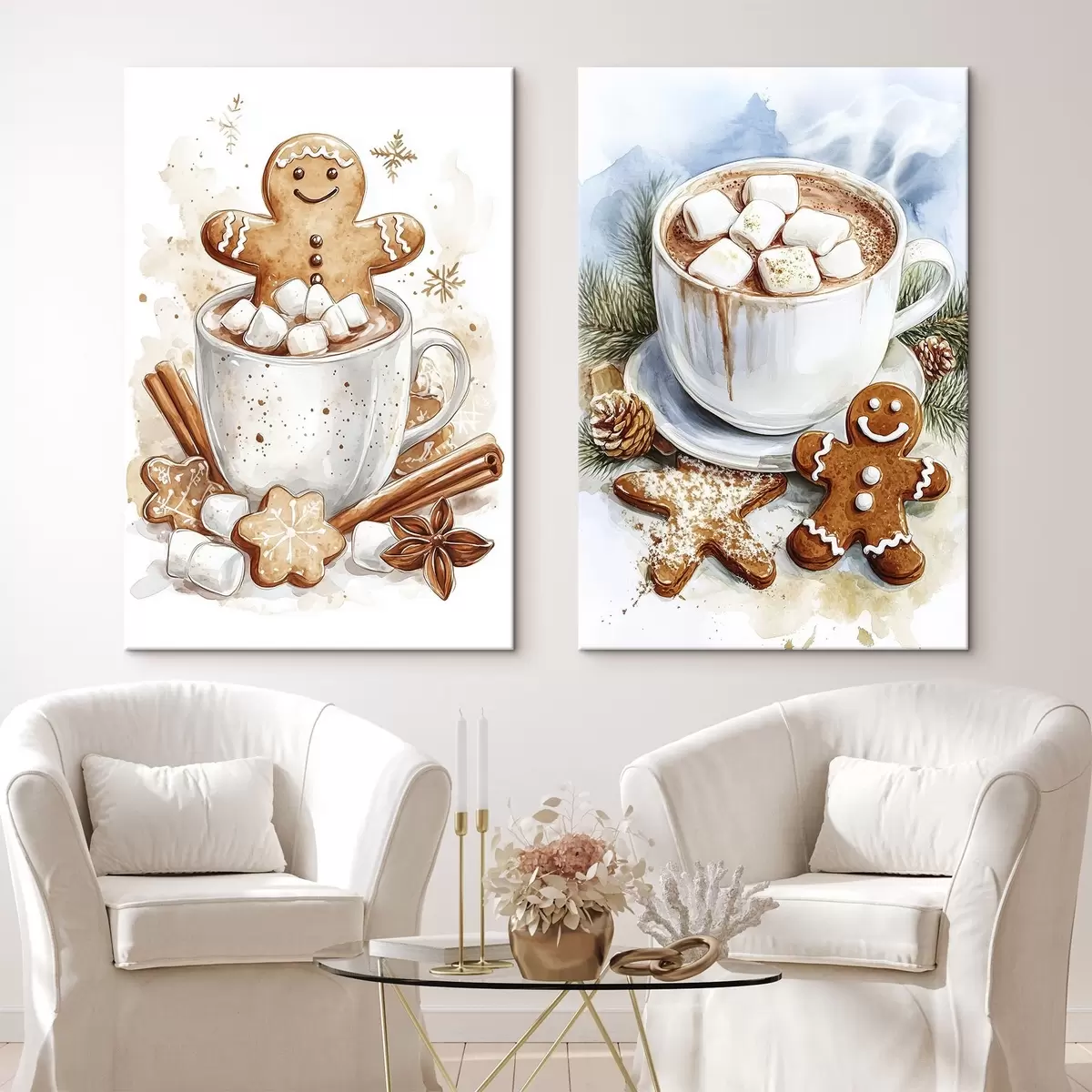Schilderij Peperkoekmannen, kop cacao, koekjes, kaneel, dennenboom, aquarelstijl Art. m00386