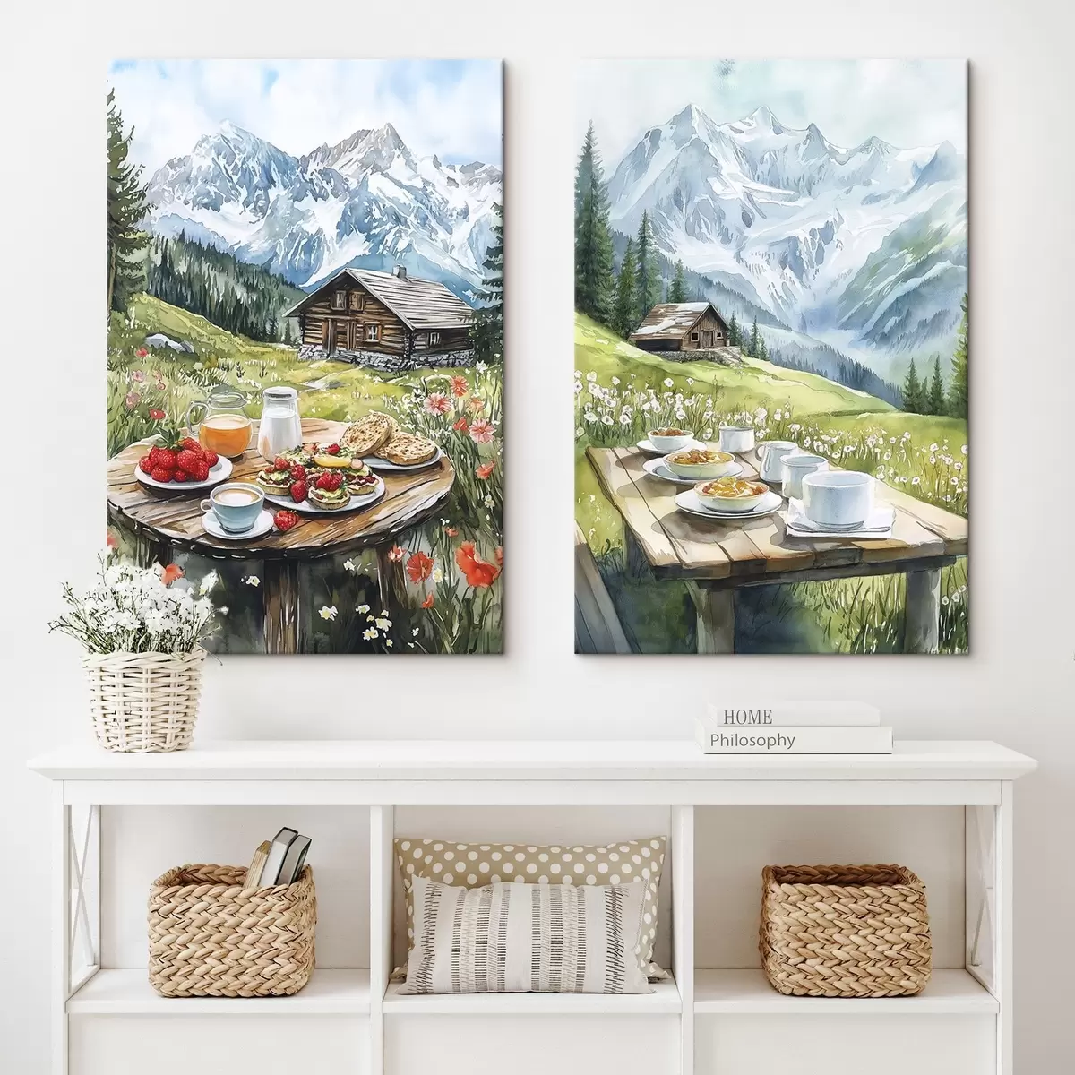 Schilderij De Alpen, prachtig berglandschap, esthetisch ontbijt, houten huizen Art. m00403