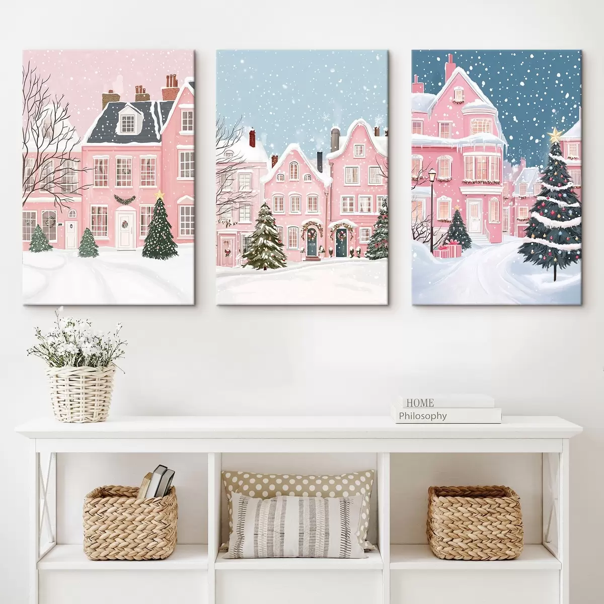Schilderij Prachtige winterstad met roze huizen, dennenbomen, sneeuwvlokken Art. m00410