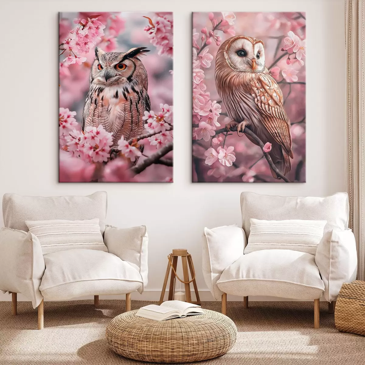 Schilderij Uilen op de kersenboom, roze bloemen, realisme, natuur Art. m00411