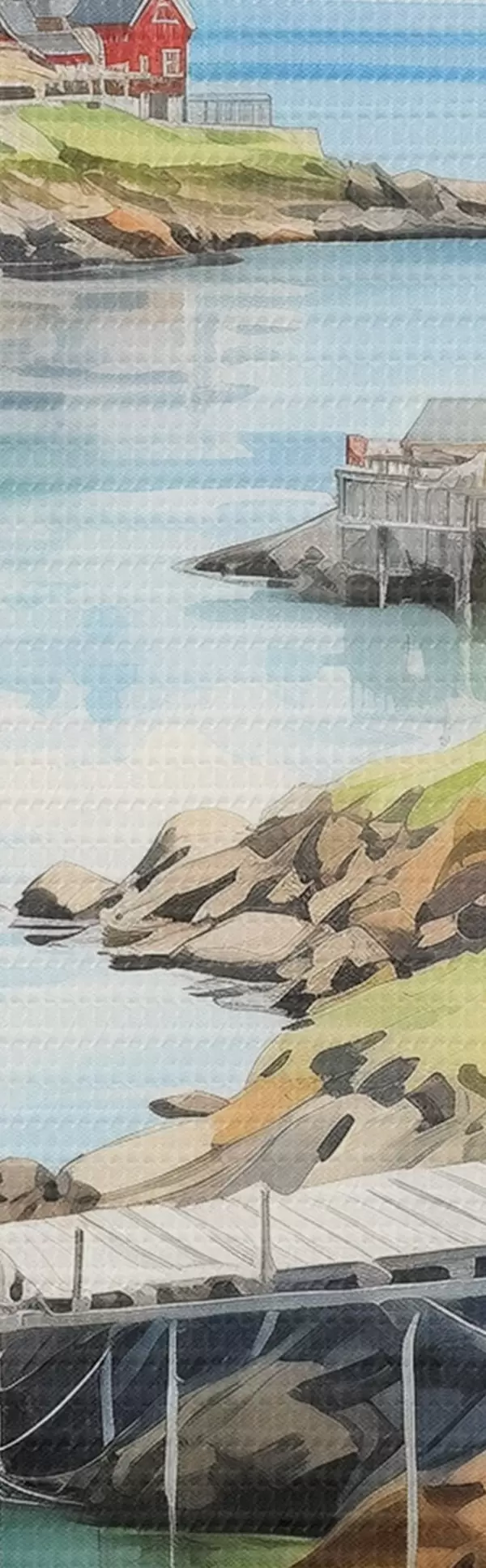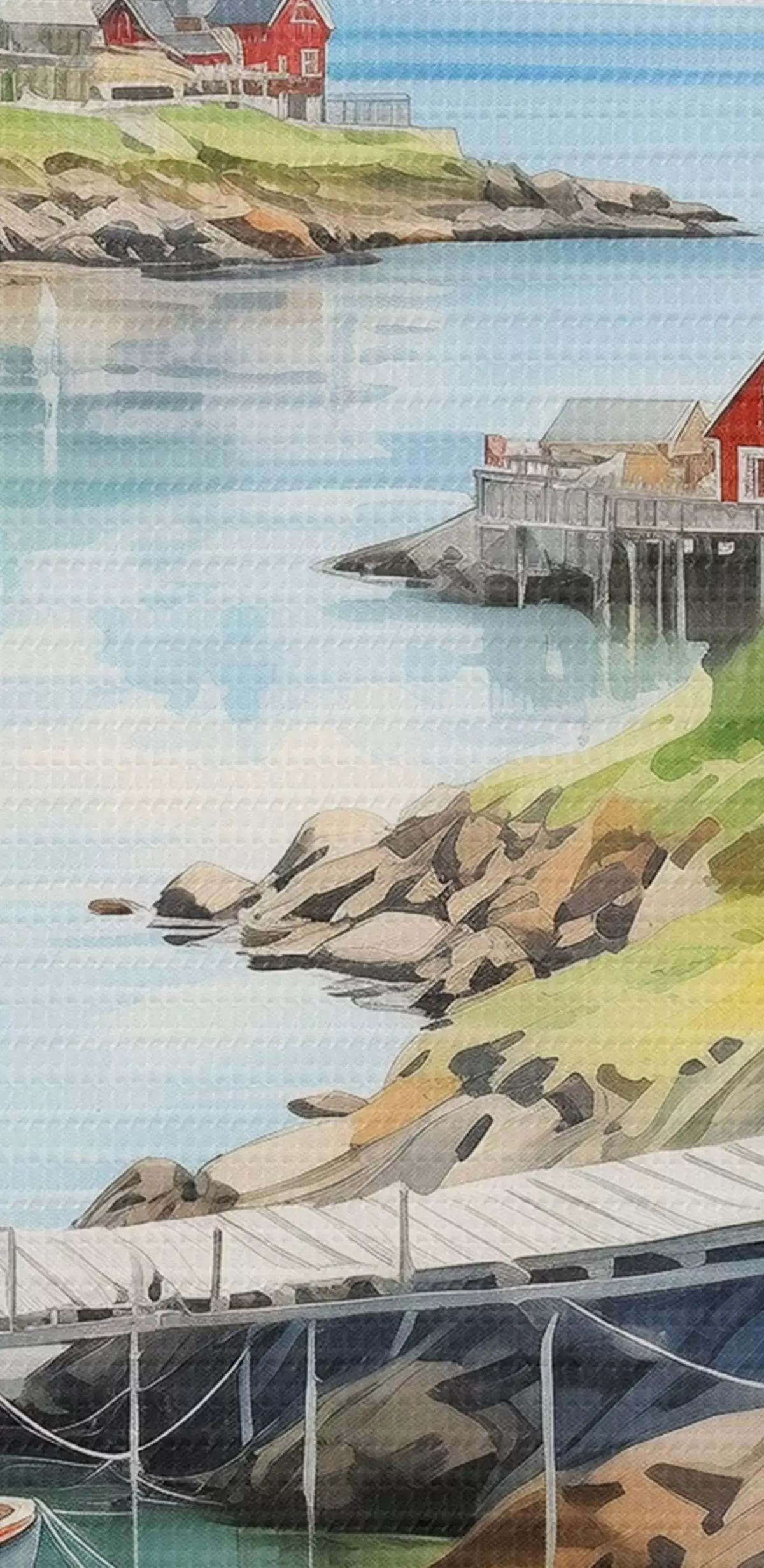 Schilderij Noorwegen natuur, Lofoten eilanden, zomer landschap, rode huizen, bergen, boten Art. m00421