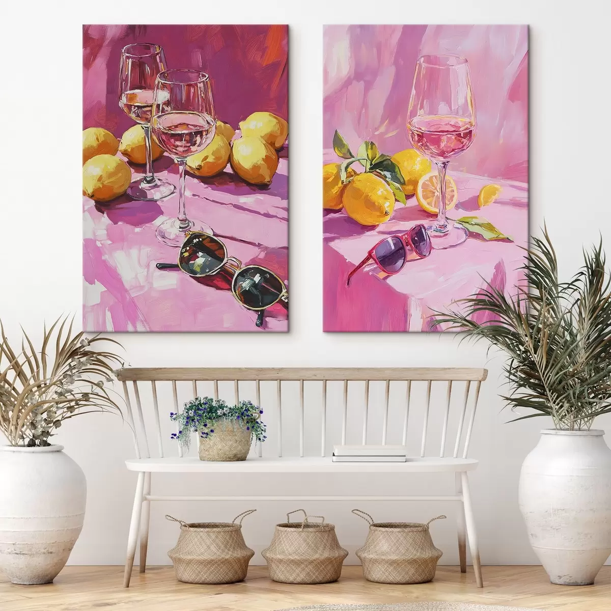 Schilderijen Abstractie in olieverfstijl met glazen champagne, citroenen en zonnebrillen, roze kleuren m00444
