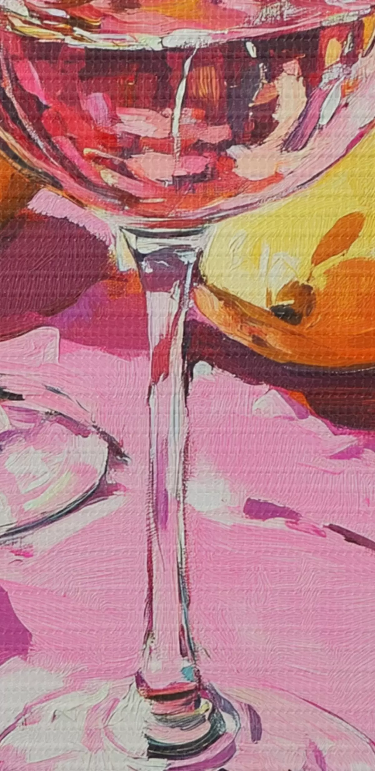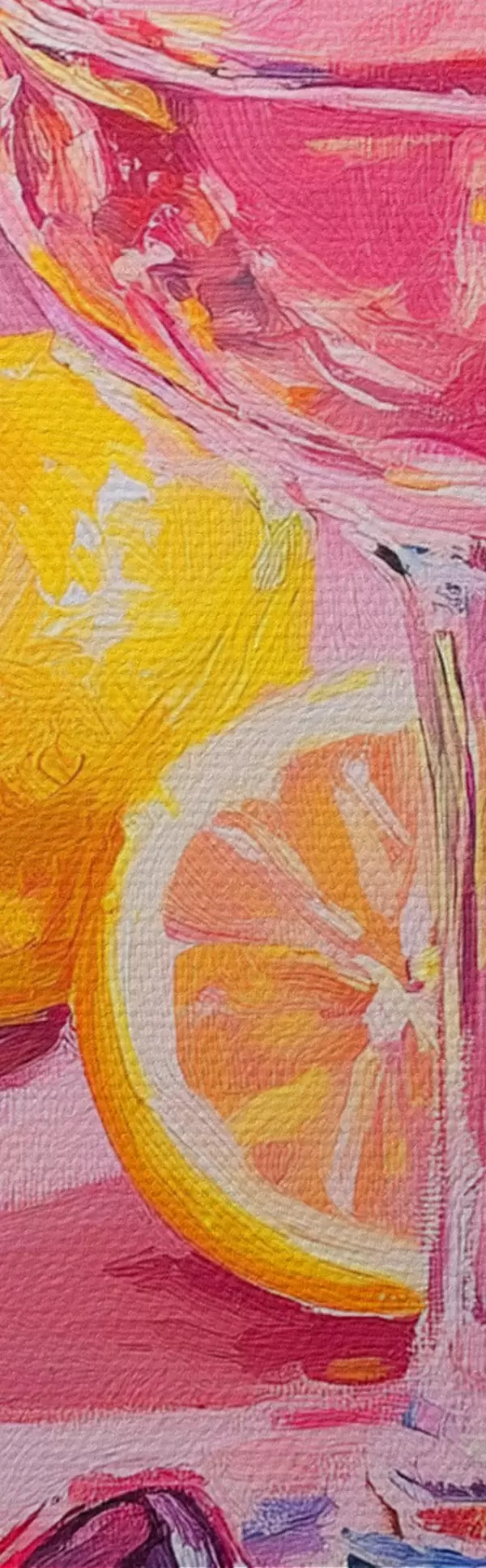Schilderij Abstractie in olieverfstijl met glazen champagne, citroenen en zonnebrillen, roze kleuren Art. m00444