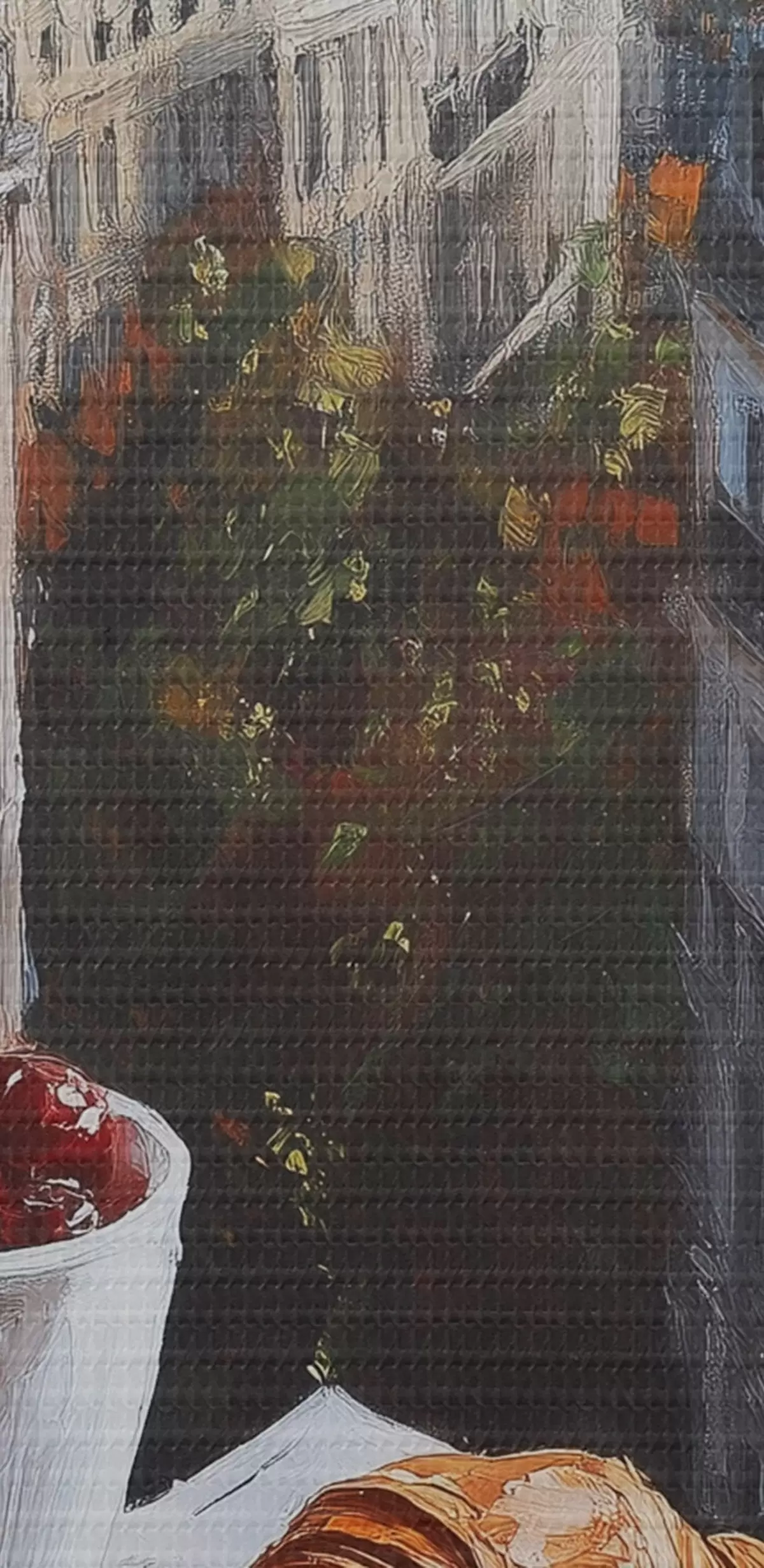 Het schilderij kan voorzichtig worden schoongeveegd met een droge zachte doek of spons; het wordt niet aanbevolen om natte producten te gebruiken. Het gebruik van een vochtige spons is alleen toegestaan als het schilderij gevernist is.