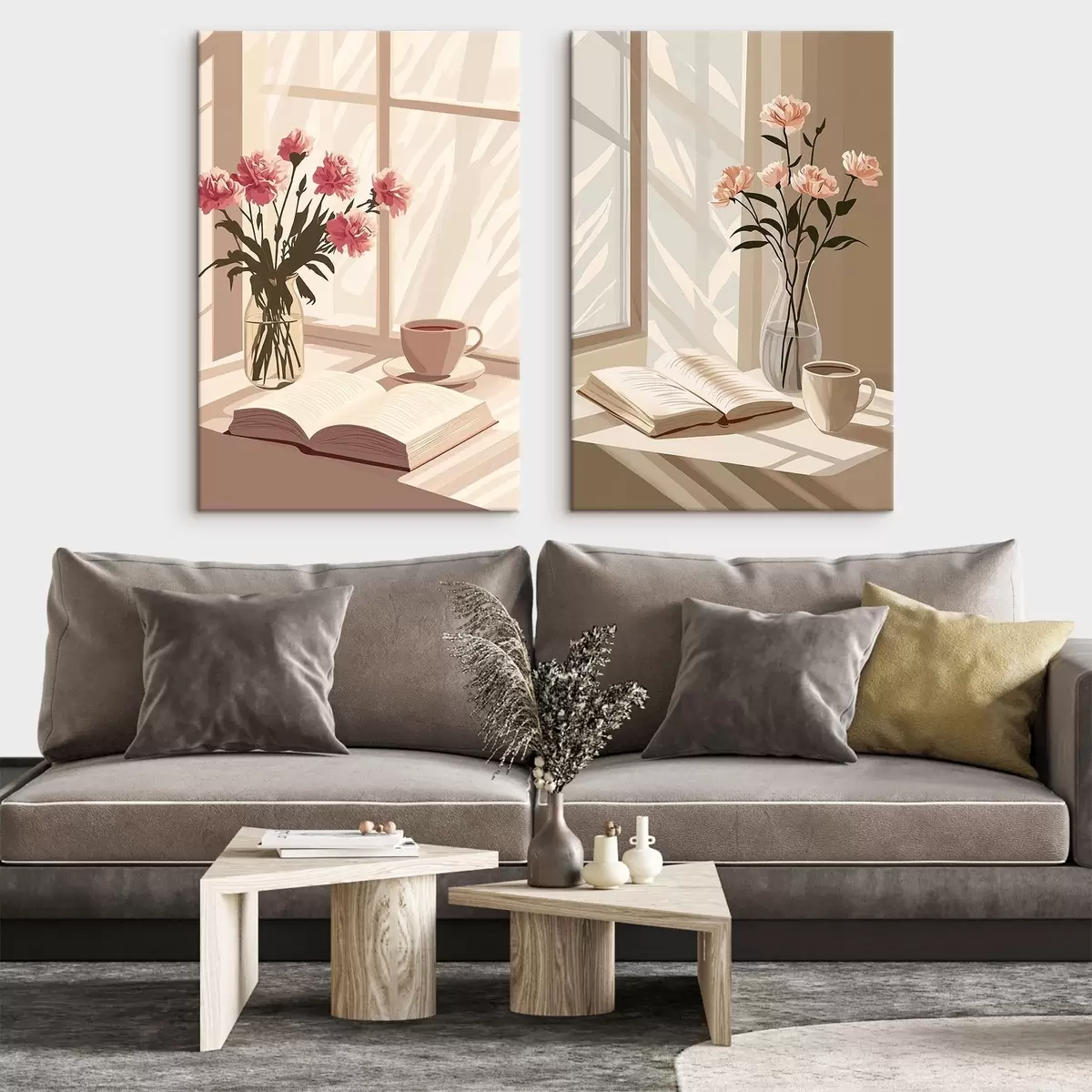 Schilderijen Abstractie, ochtend esthetiek, kopje koffie, boek, bloemen m00448