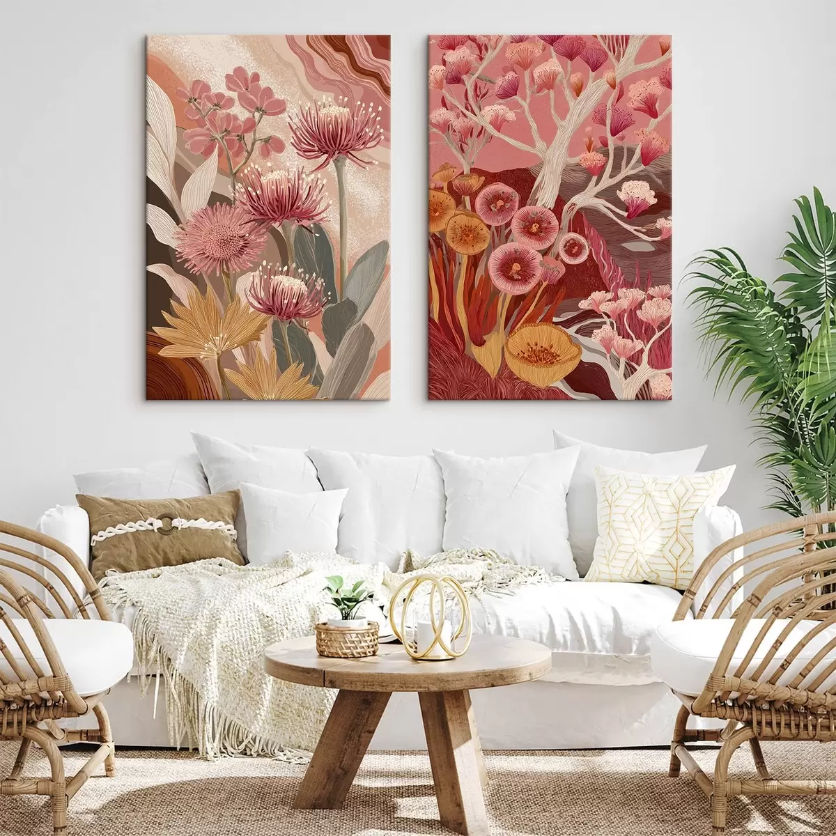 Schilderijen Boho stijl bloemen, gedetailleerde tekening, bordeauxrode kleuren m00476