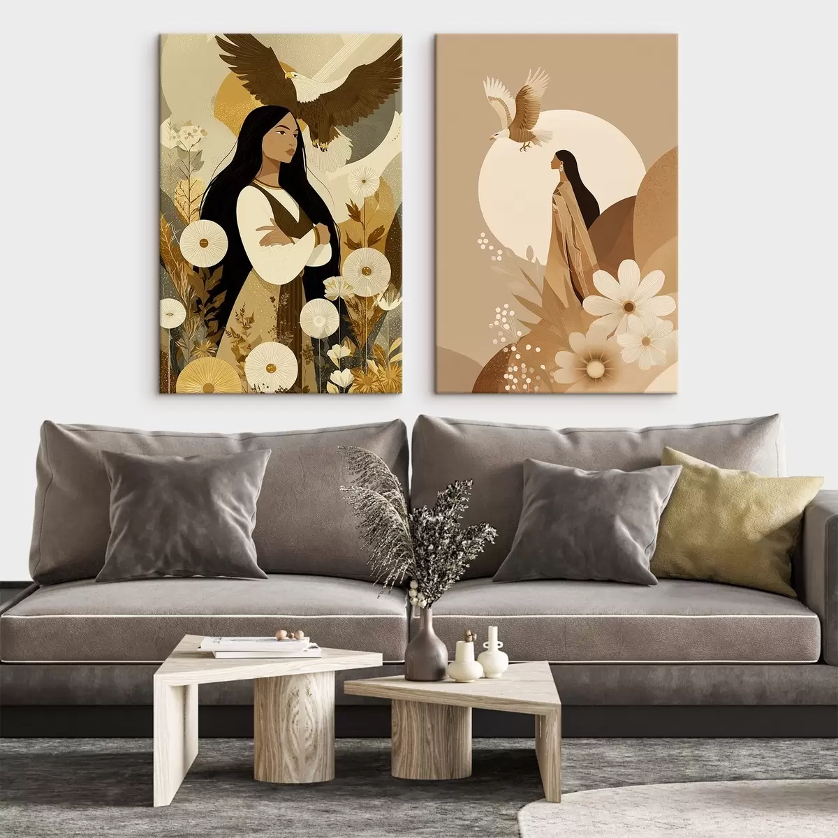 Schilderijen Vrouwen met vliegende adelaars, tribale stijl, beige kleuren m00477