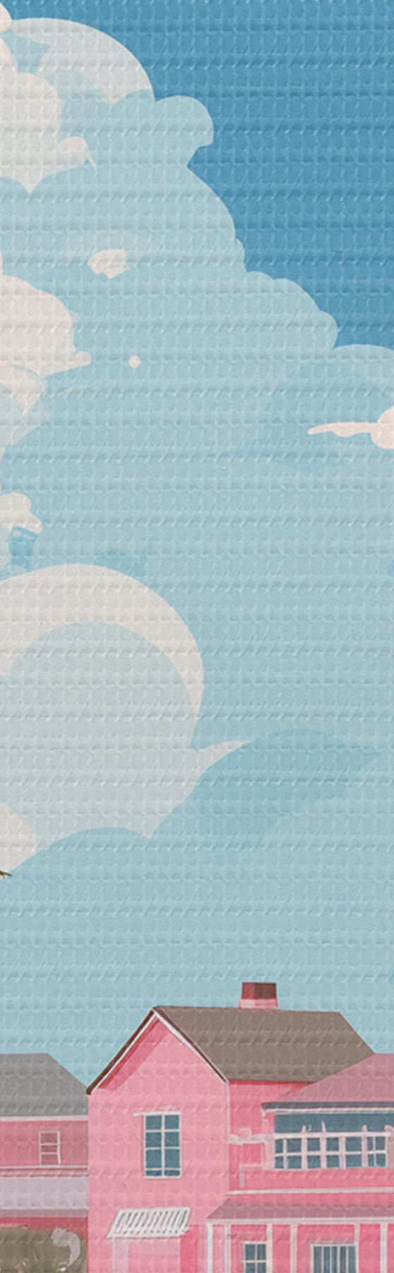 Schilderijen Roze zomerstrand met zon, zeilboot en huizen m00479