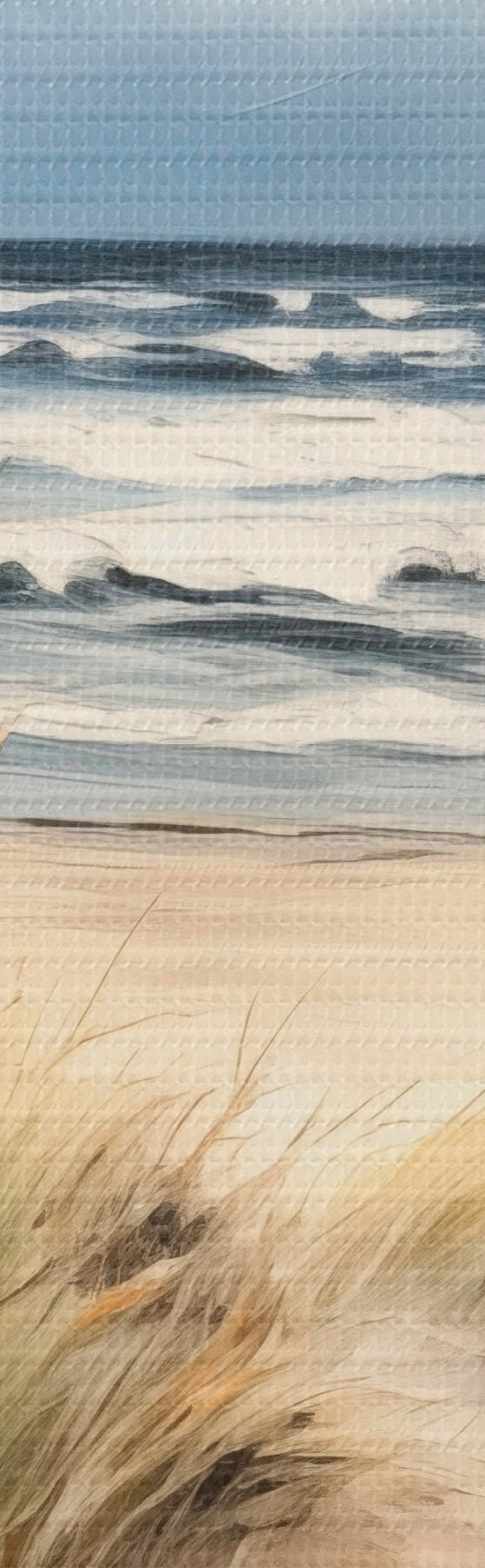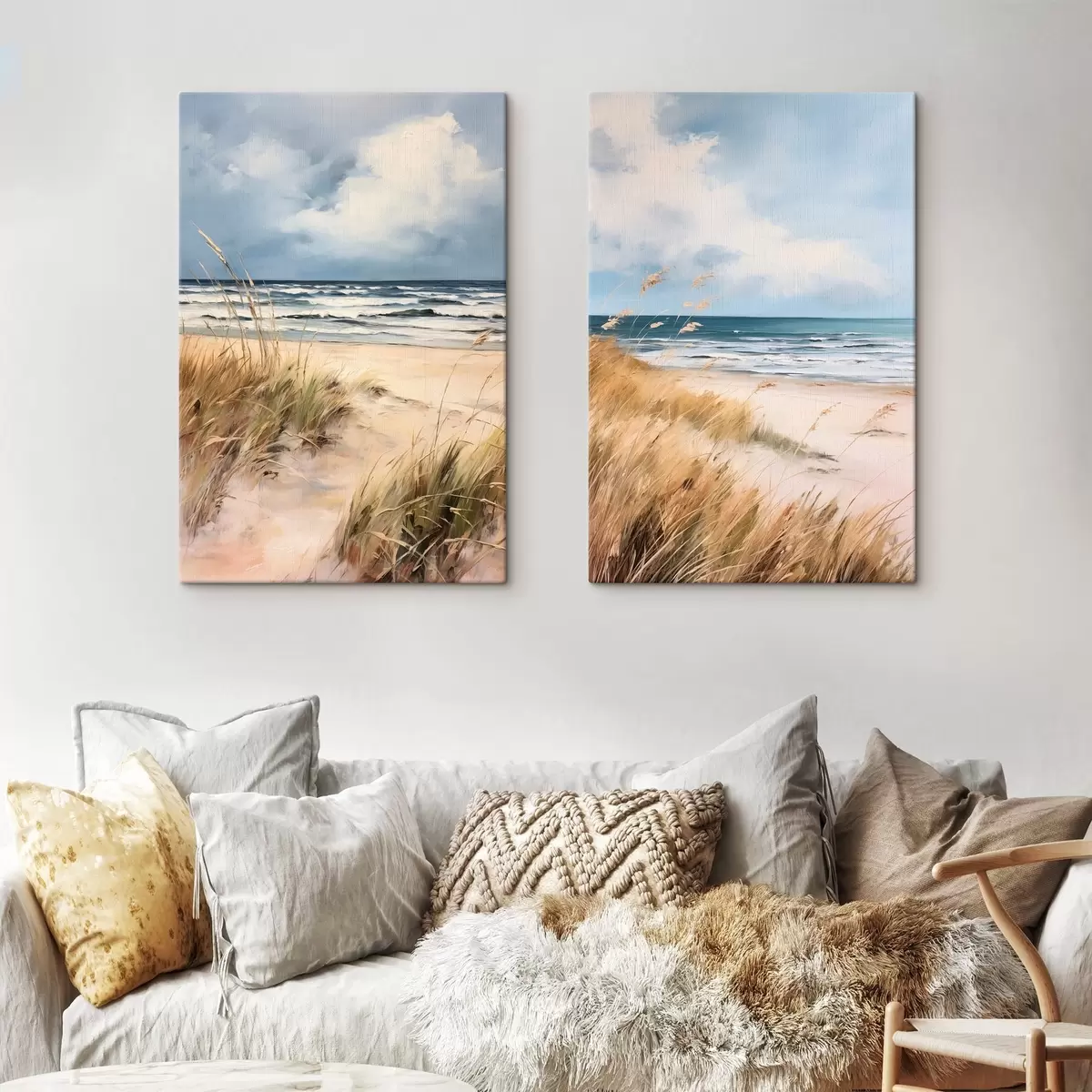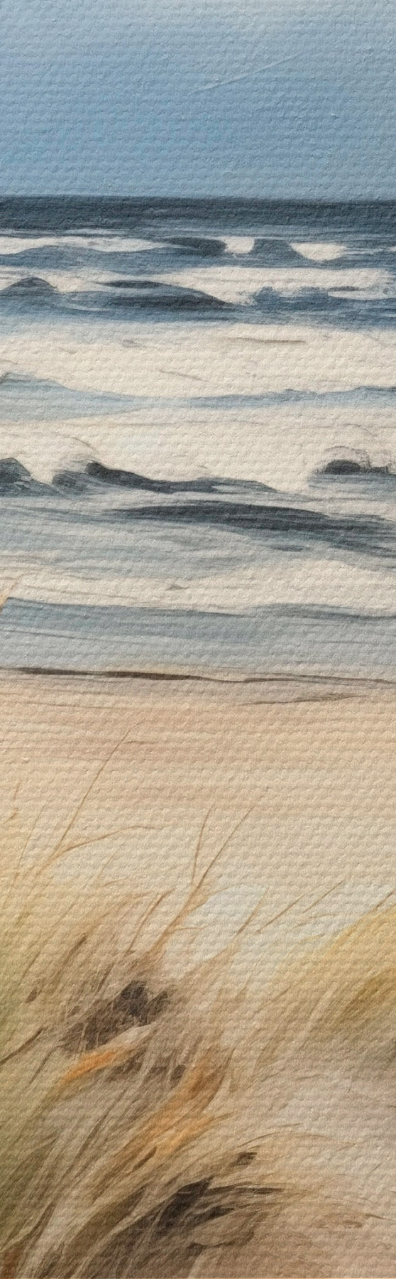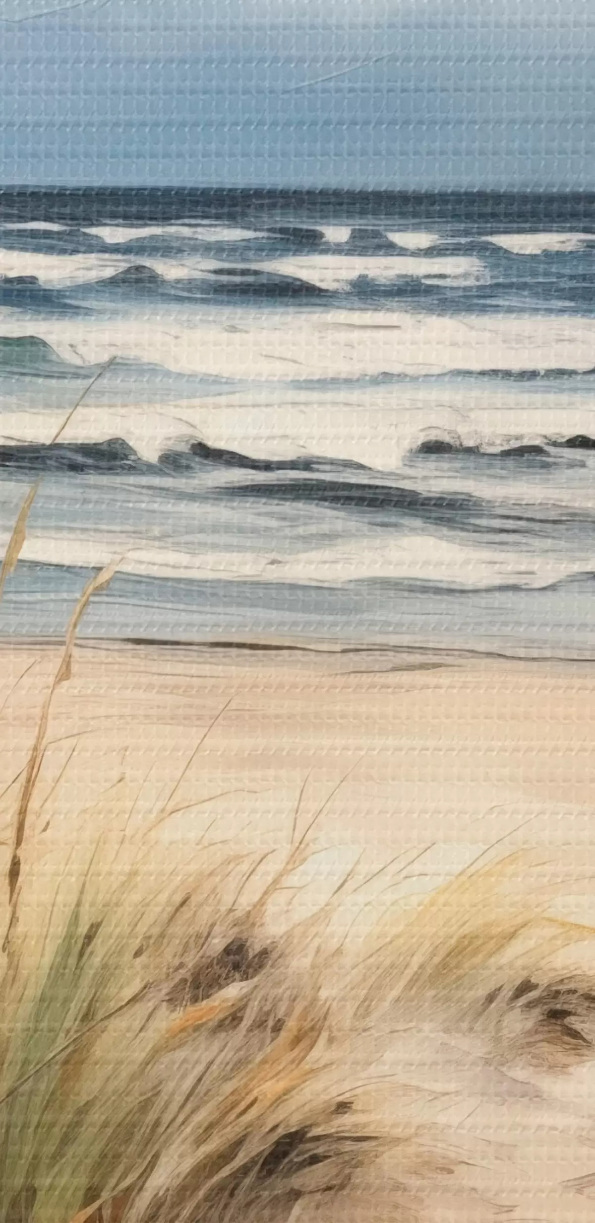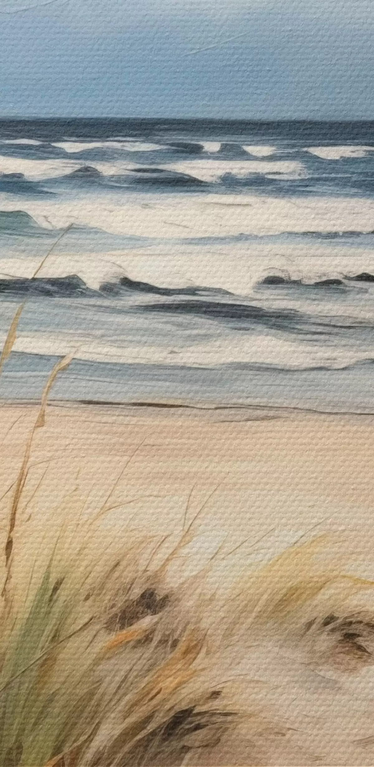 Schilderij Een zandstrand met hoog gras op de voorgrond, de oceaan met golven en een bewolkte lucht op de achtergrond Art. m00521