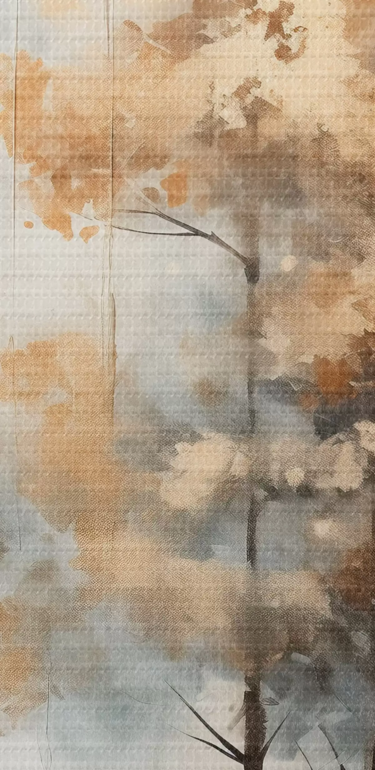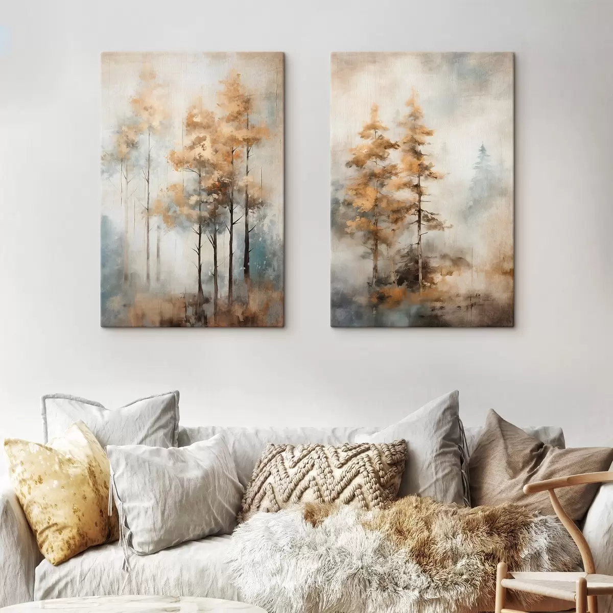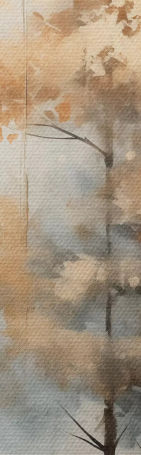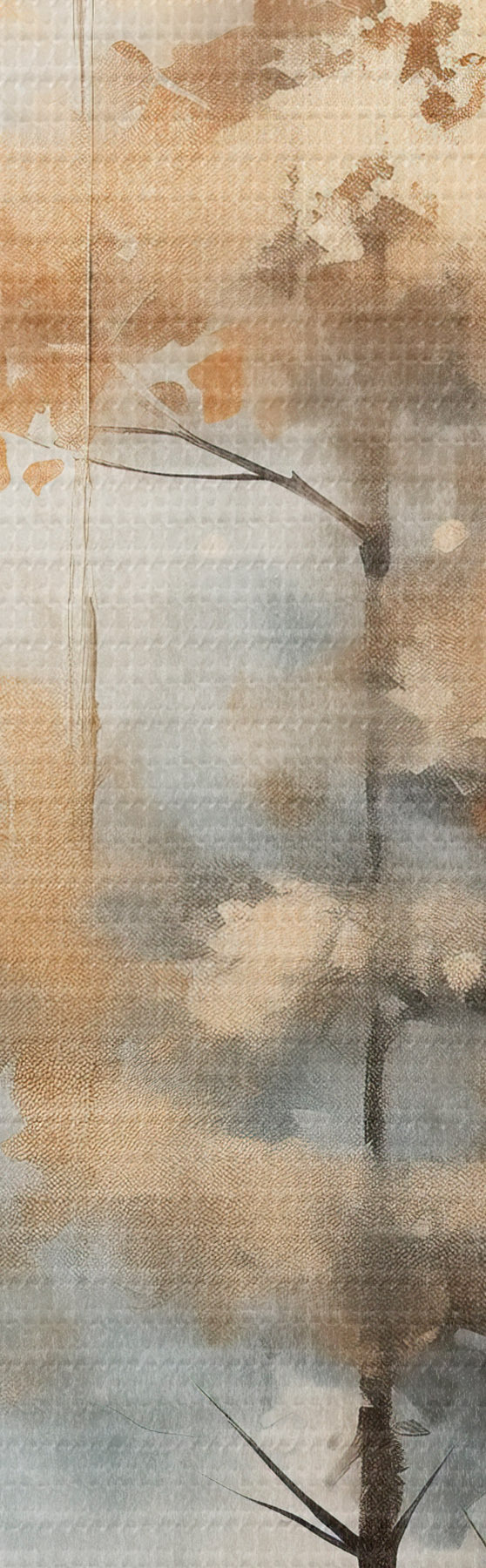 Schilderijen Hoge bomen met gele bladeren in een bos, de achtergrond is een mix van zachte blauwe en bruine tinten  m00528