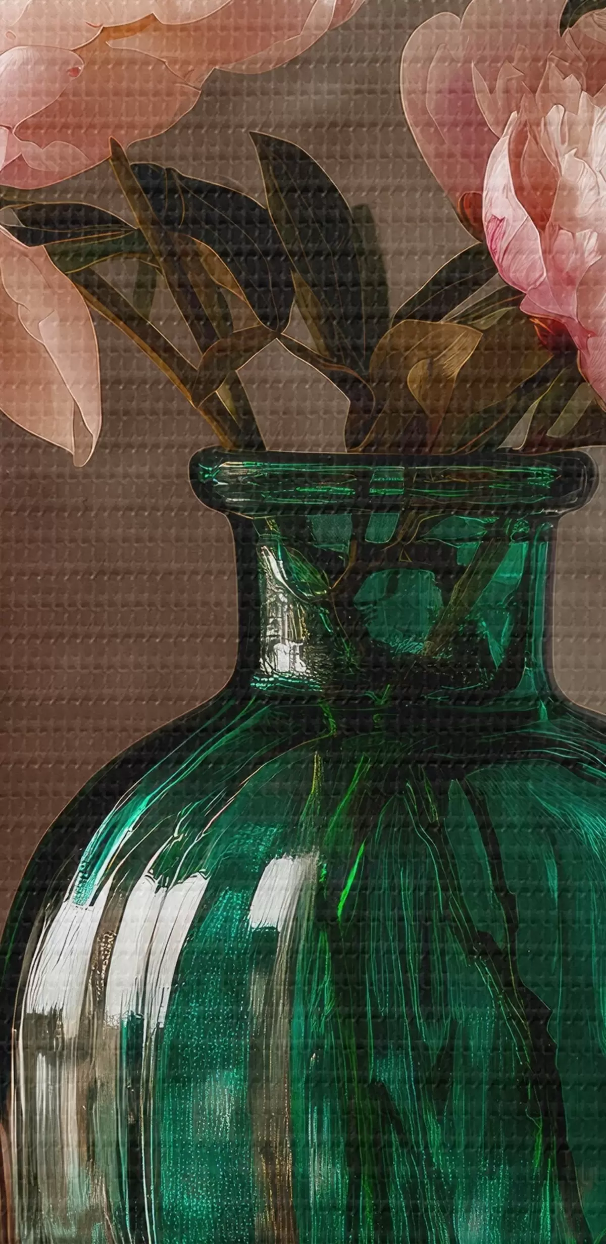 Schilderij Gepaarde compositie met roze pioenrozen in een vaas en op canvas Art. m00578