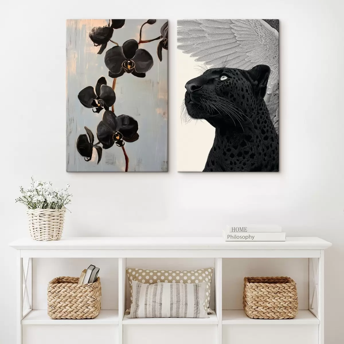 Schilderij Donkere orchideeën en gevleugeld beest: artistieke compositie Art. m00640