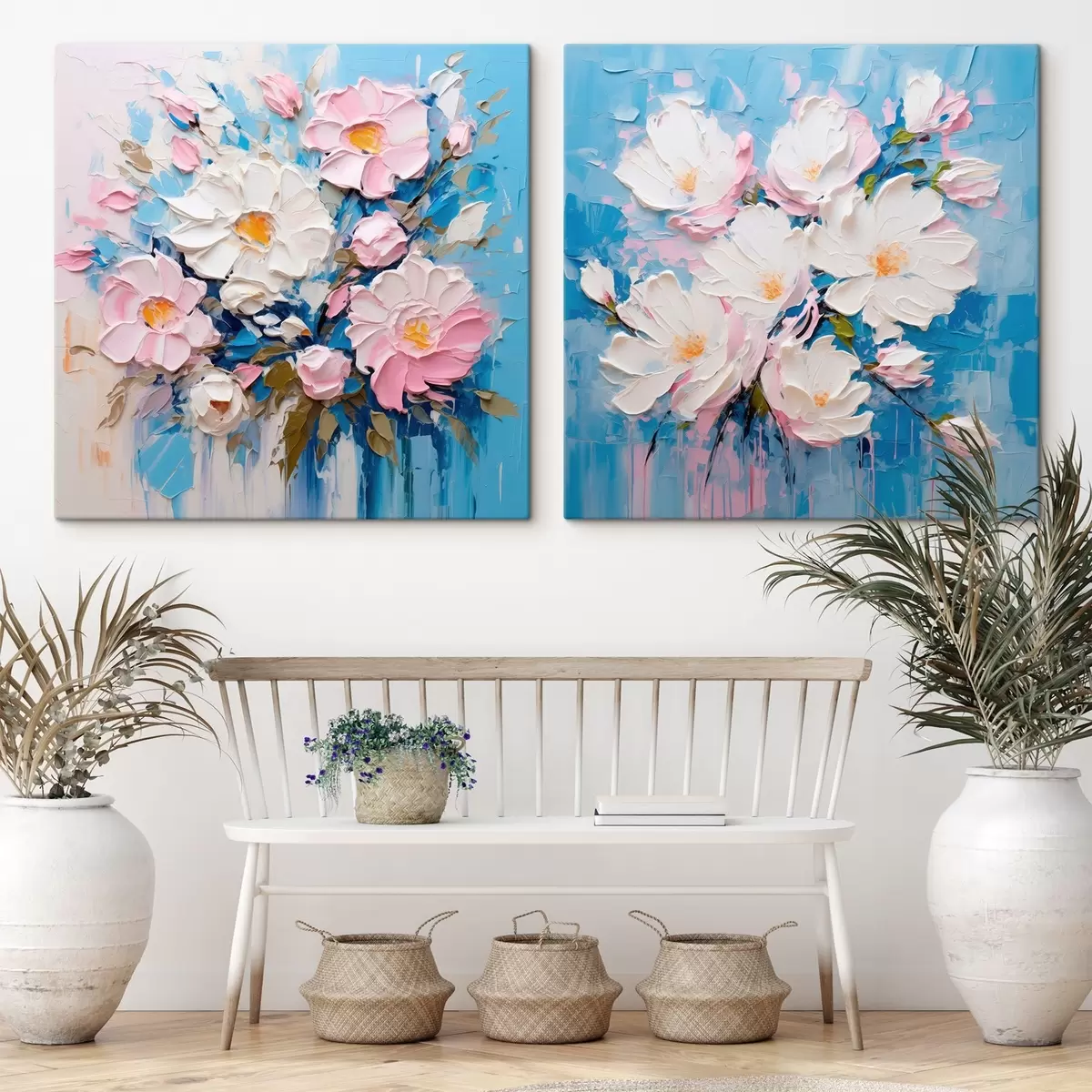 Schilderij Abstracte bloemen: decoratieve compositie in roze en blauwe tinten Art. m00643
