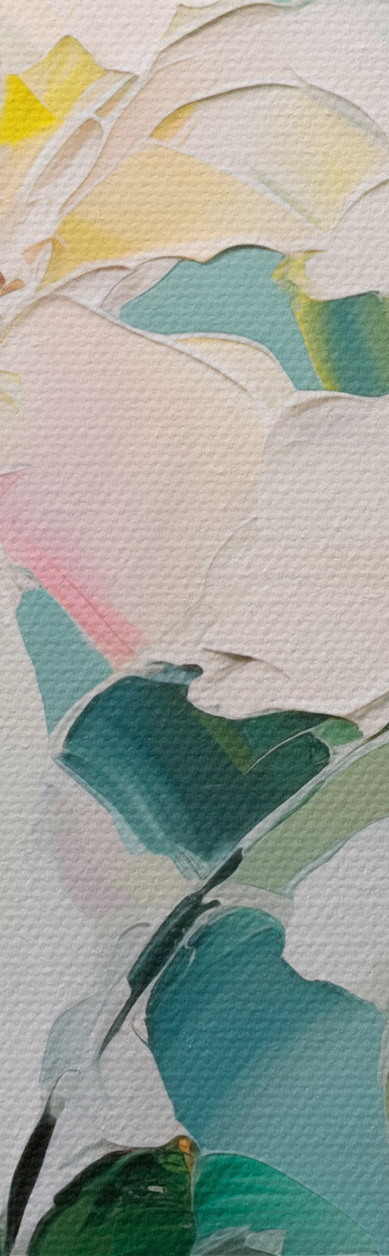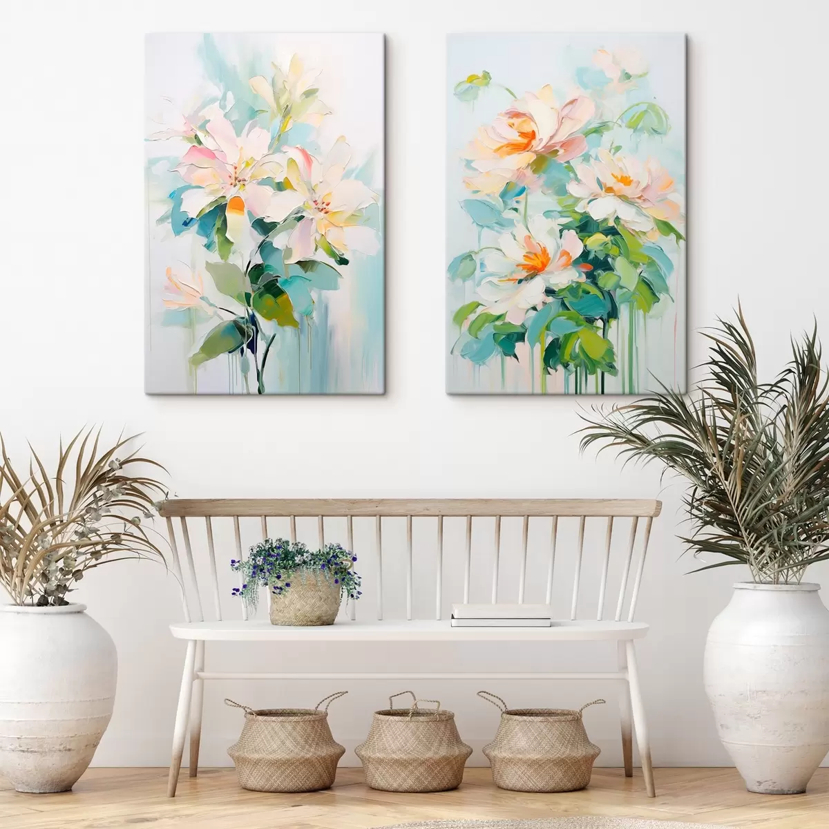Schilderij Witte en pastel perzik bloemen, groene bladeren, zachte penseelstreken olieverf imitatie, lichtblauwe achtergrond Art. m00644