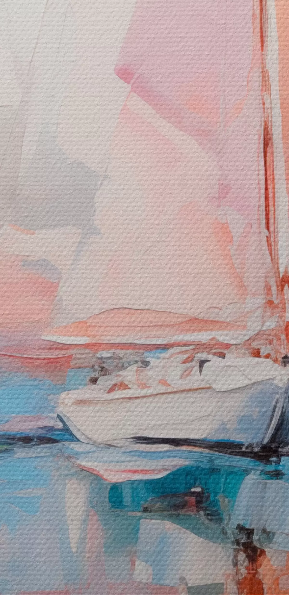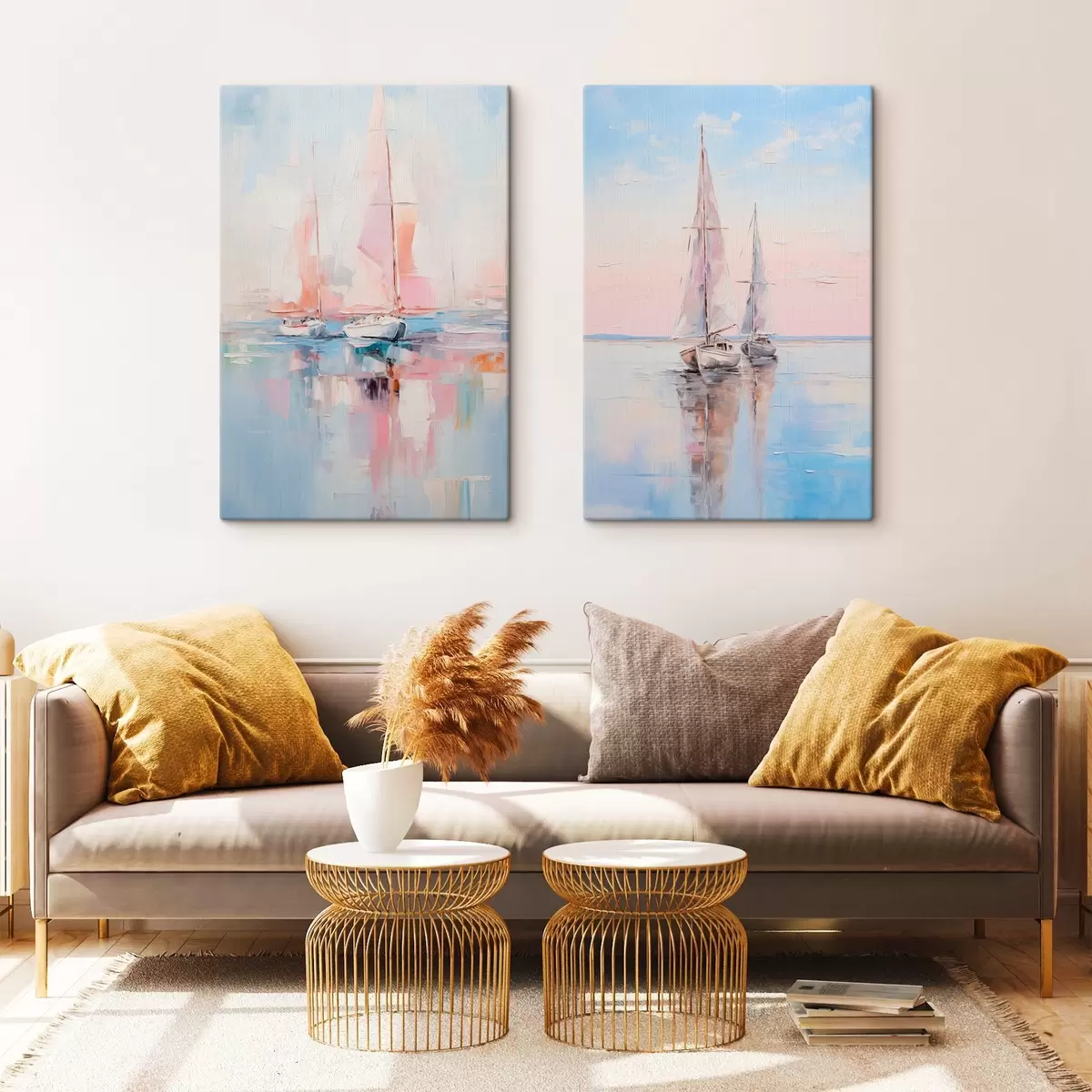 Schilderij Zeilboten met roze zeilen drijvend op een kalme zee, reflecties van de boten in het water, zachte pastelkleuren Art. m00648