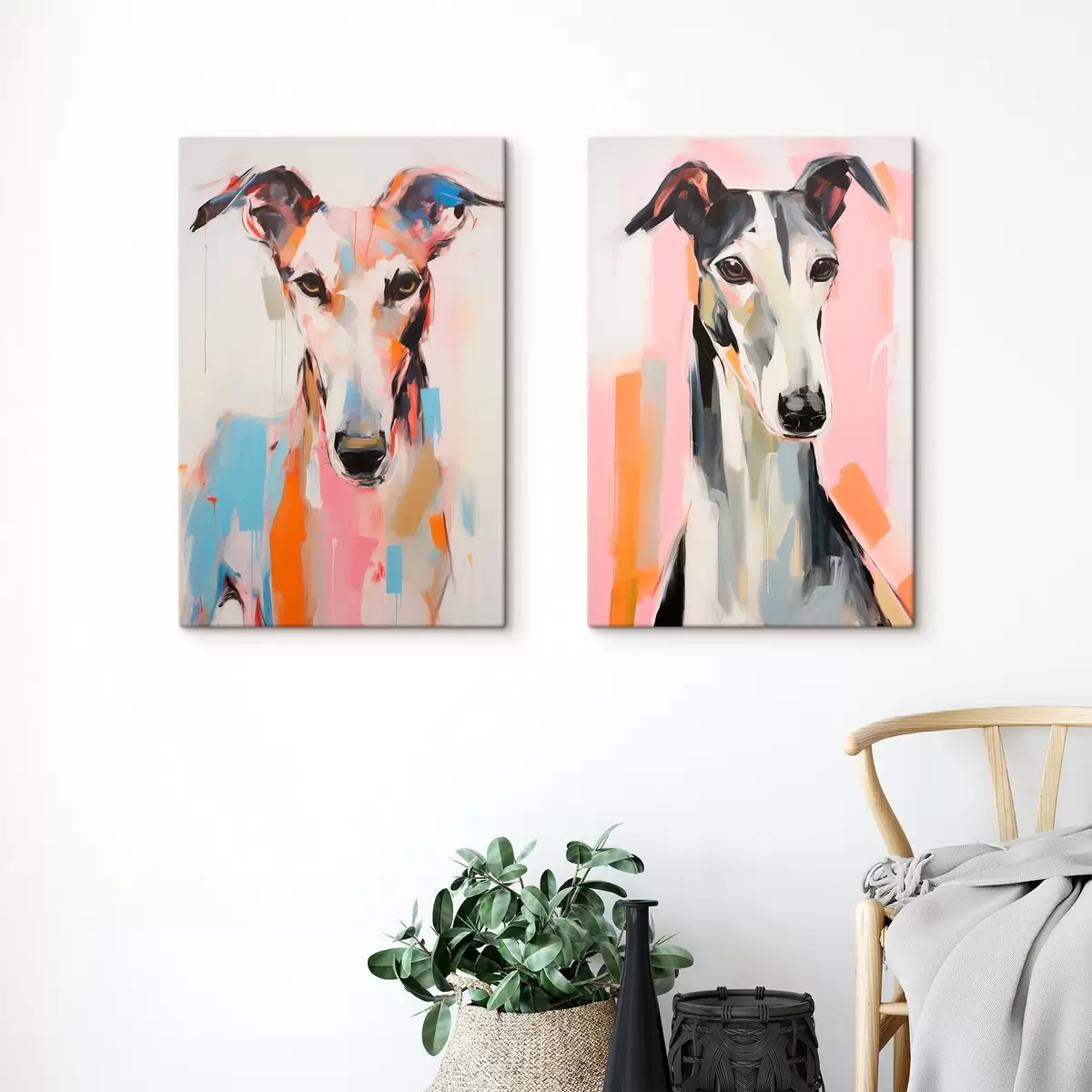 Schilderij Een windhond, beschilderd met levendige kleuren zoals oranje, roze en blauw, tegen een effen witte achtergrond Art. m00652