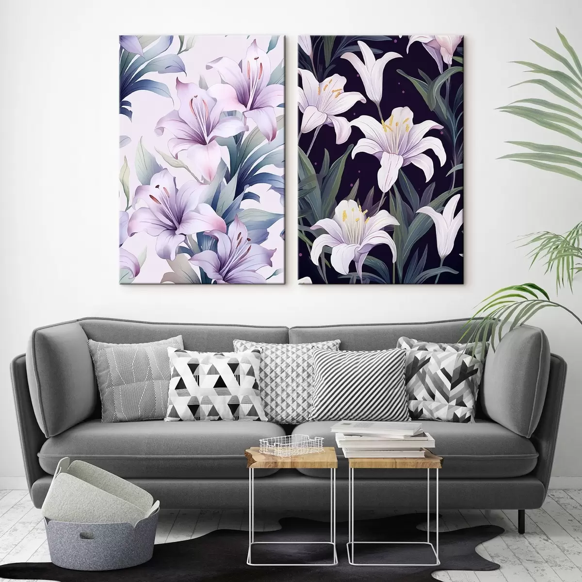 Schilderijen Delicate roze lelies met groene bladeren op lichte en donkere achtergrond m00689