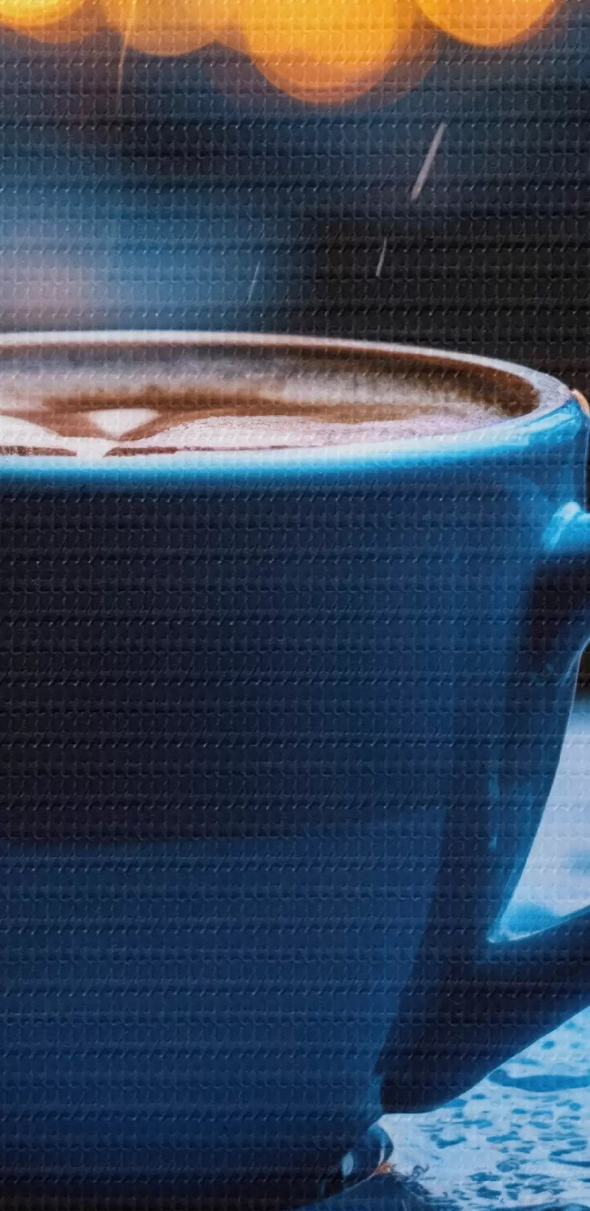 Schilderij Blauwe bloemen met waterdruppels en een kopje koffie in de regen Art. m00694