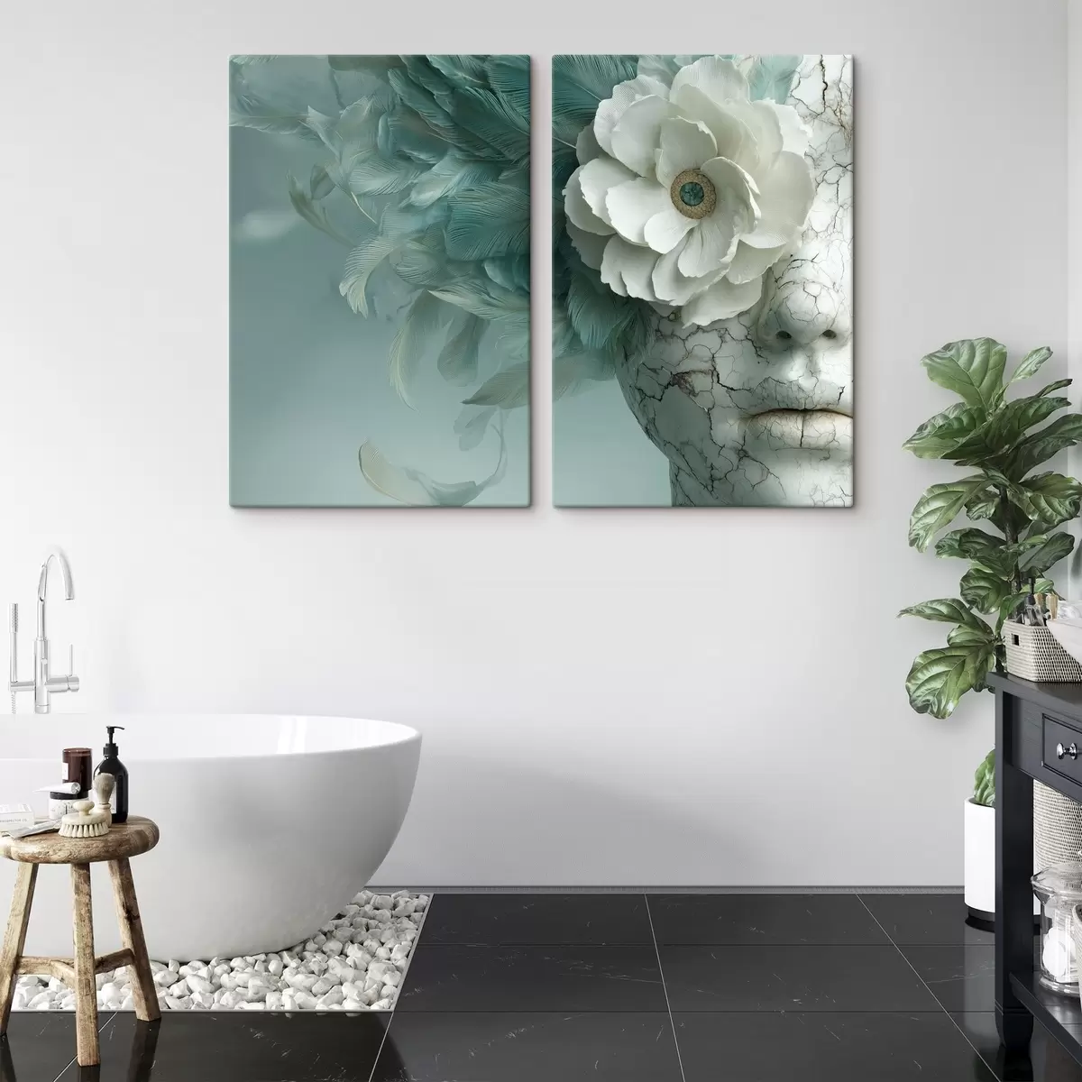 Schilderij marmeren gezicht van een meisje met een bloem en veren Art. m00699