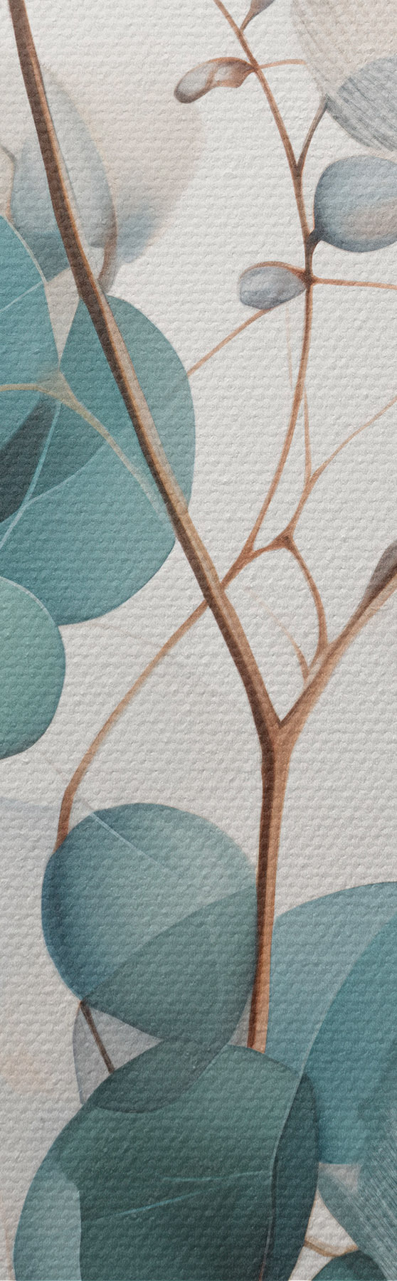 Schilderijen Eucalyptustak met blauwe bladeren en witte bloemen, lichte achtergrond m00829