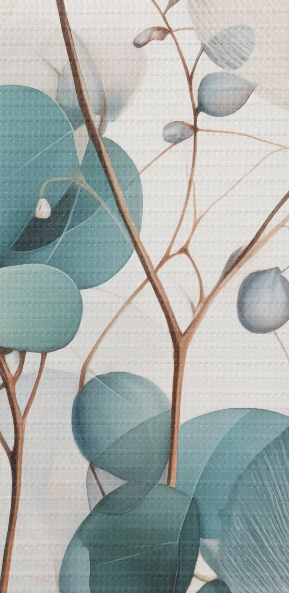 Schilderijen Eucalyptustak met blauwe bladeren en witte bloemen, lichte achtergrond m00829