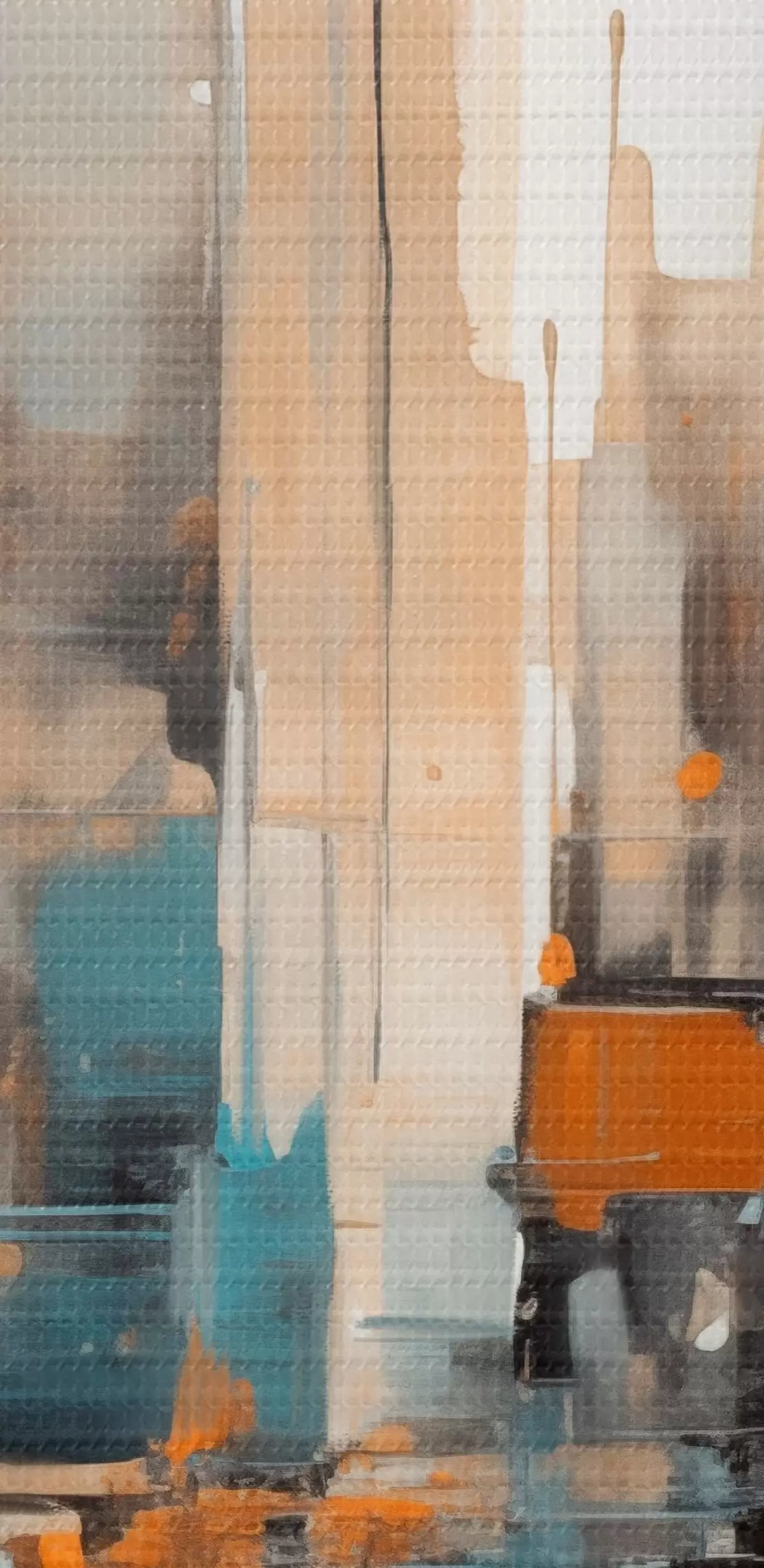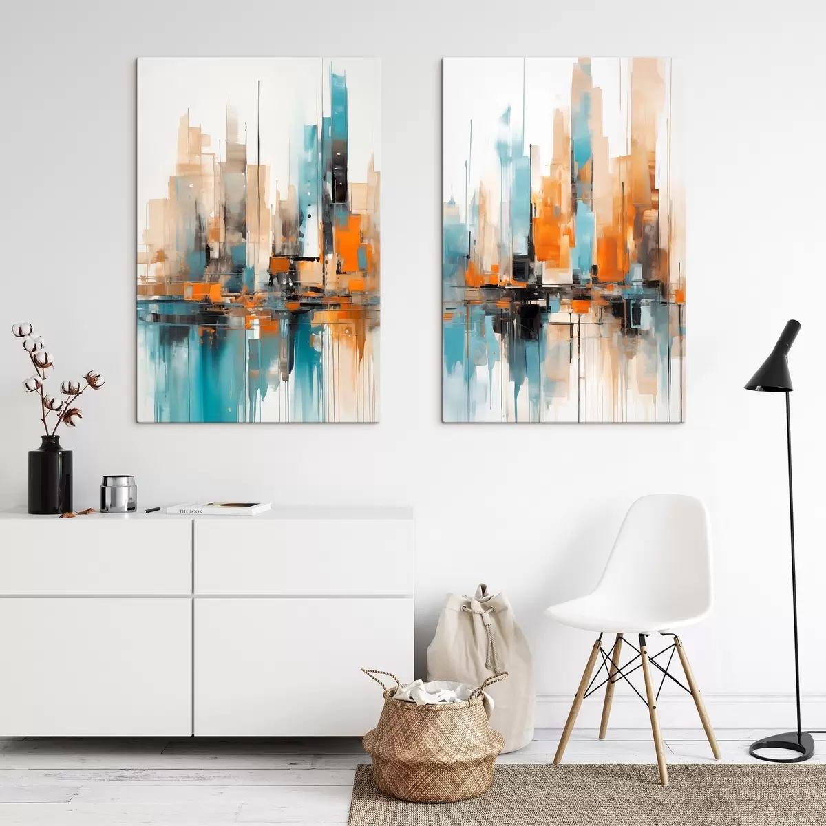 Schilderij Abstract stadsgezicht met verticale penseelstreken in tinten oranje, blauw en wit, schilderstijl Art. m00876