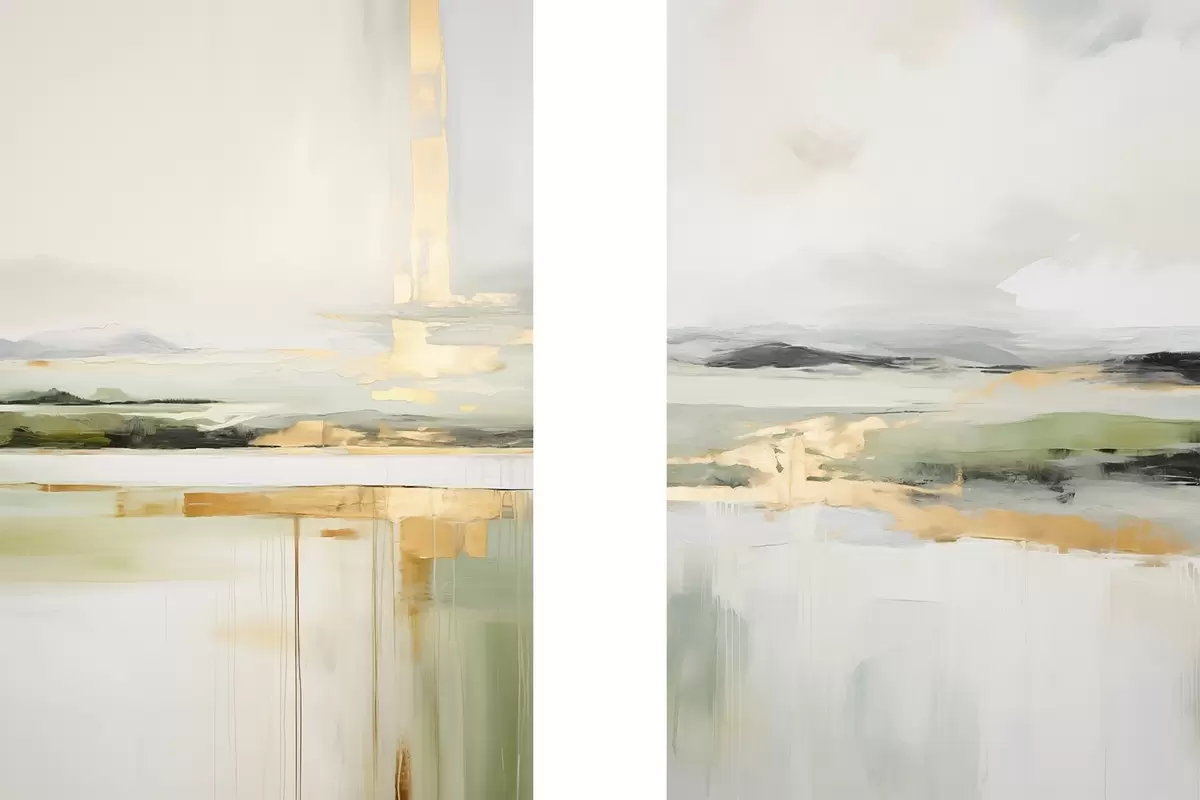 Schilderij Abstract landschap met gele accenten, een minimalistische compositie van land, water en lucht, met gedempte kleuren Art. m00877