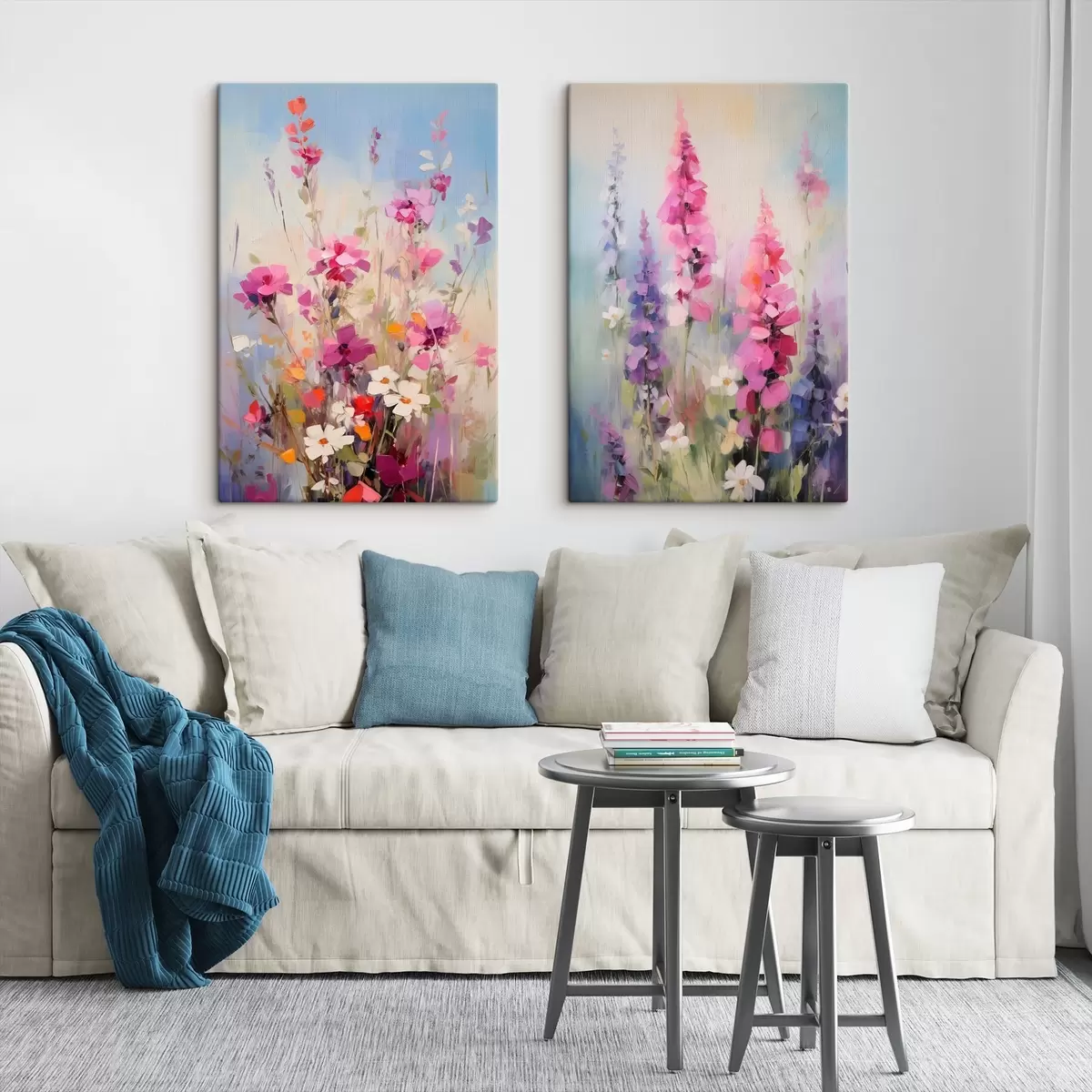 Schilderijen Levendige bloemen met witte madeliefjes in een veld, zachte penseelstreken, pastelkleuren, impressionistische stijl m00882