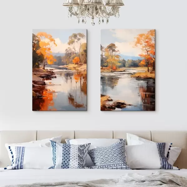 Schilderijen Herfstlandschap, rivier met bomen aan de oever, bos op de achtergrond, weerspiegelingen op het water m00883