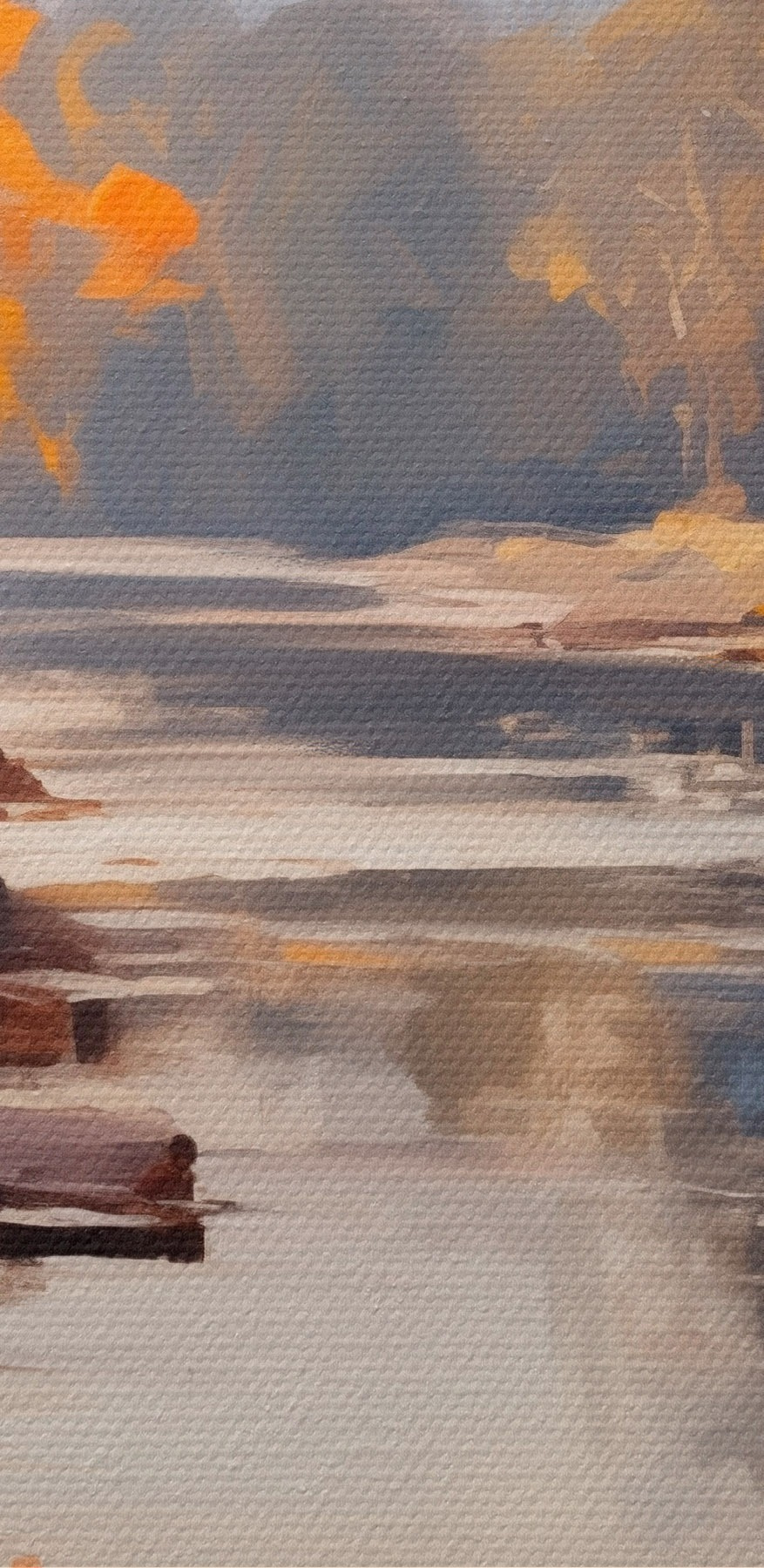 Schilderij Herfstlandschap, rivier met bomen aan de oever, bos op de achtergrond, weerspiegelingen op het water Art. m00883