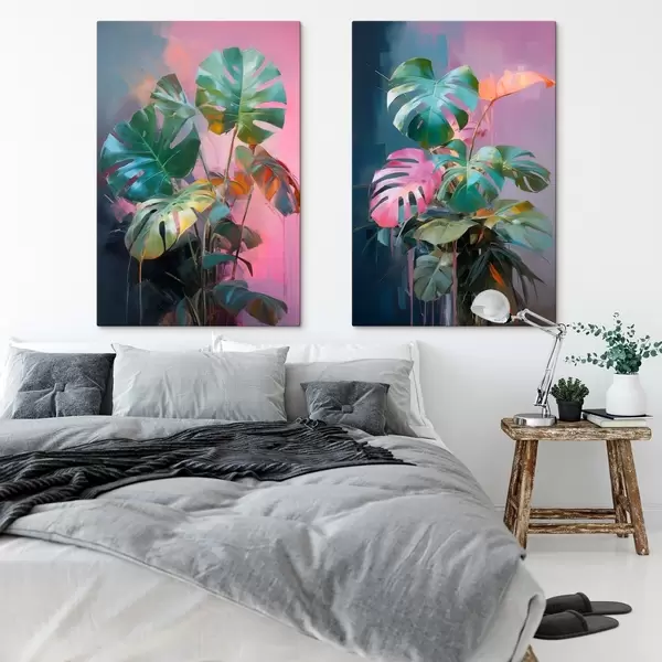 Schilderijen Abstracte monstera-plant met levendig groene bladeren, tegen een achtergrond van zachte roze en paarse tinten m00886