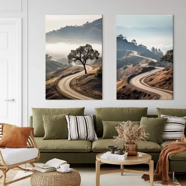Schilderijen Een kronkelende weg door een heuvelachtig landschap met droog gras onder een heldere hemel en bergen in de verte m00887