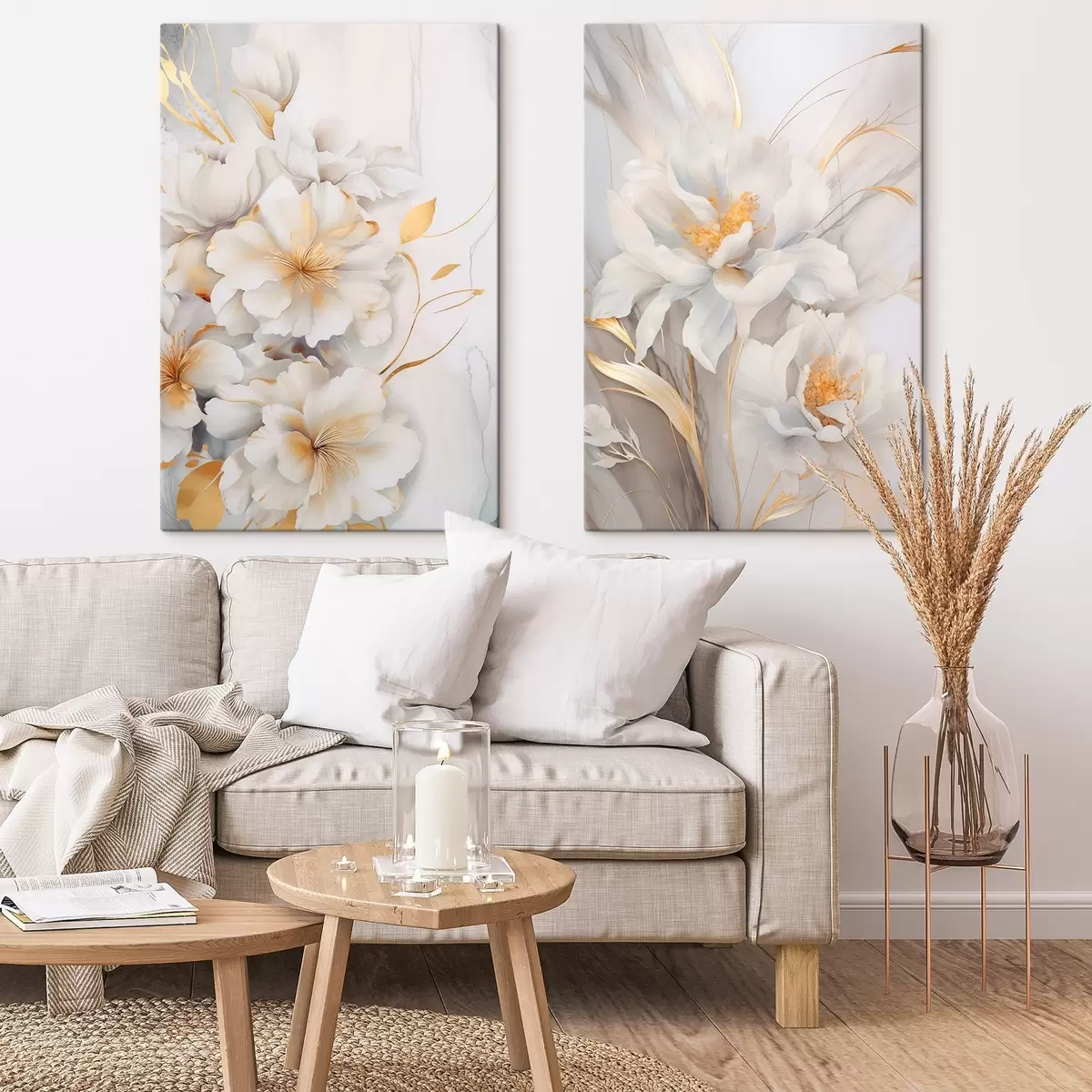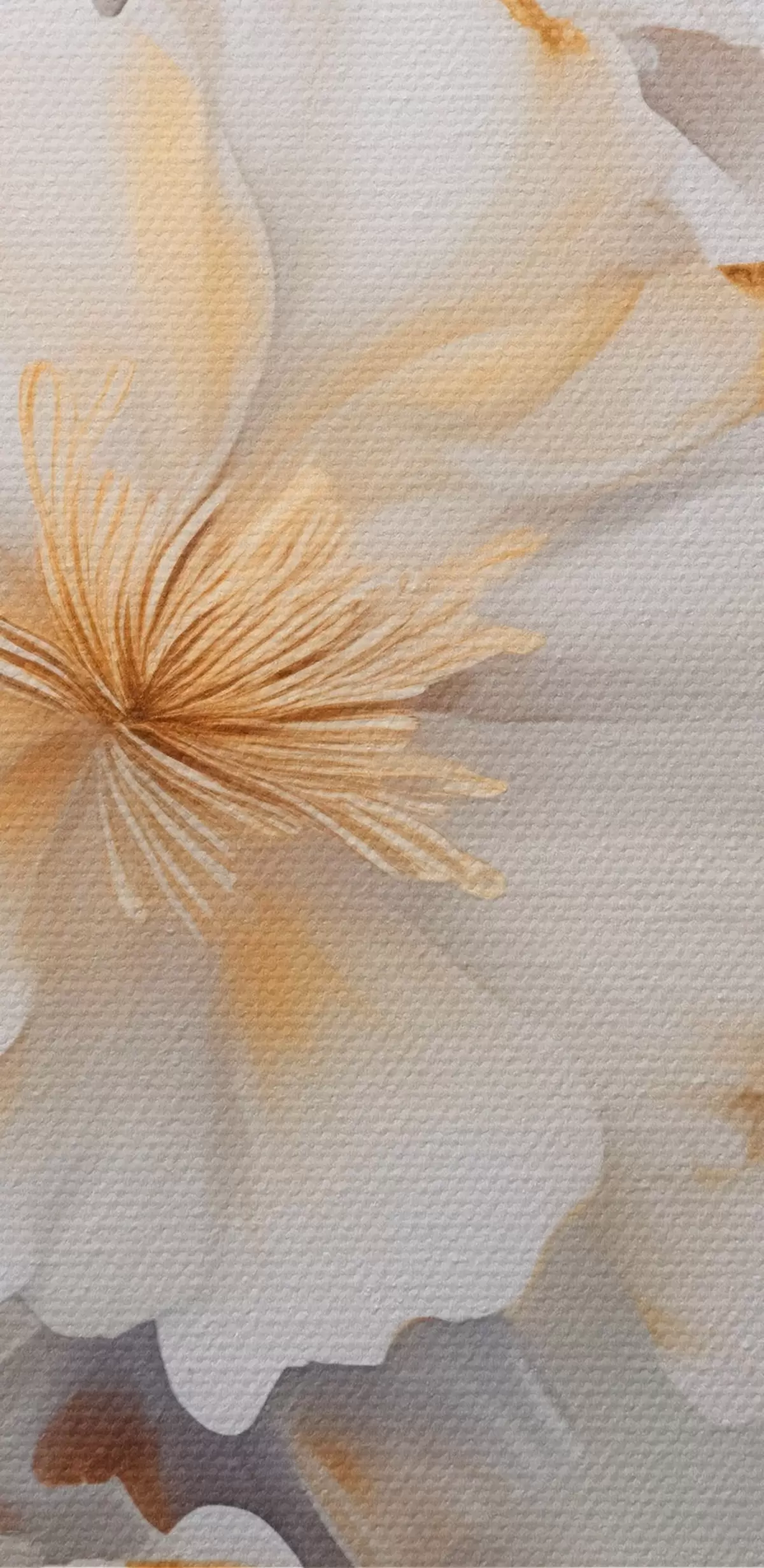 Schilderij Witte bloemen met gele details, bloemblaadjes met subtiele schaduwen, lichte achtergrond met subtiel marmereffect Art. m00889