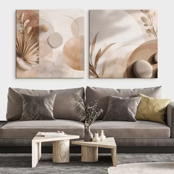 Schilderij Twee doeken met gedroogde bladeren en gestructureerde vormen Art. m00893