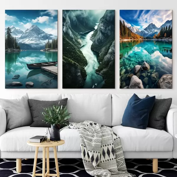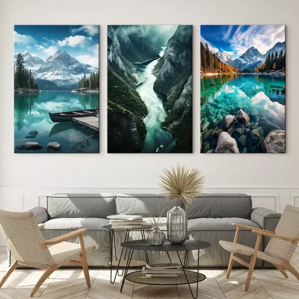 Schilderijen Alpenmeren en uitzicht op fjorden in koele blauwgroene tinten m00961