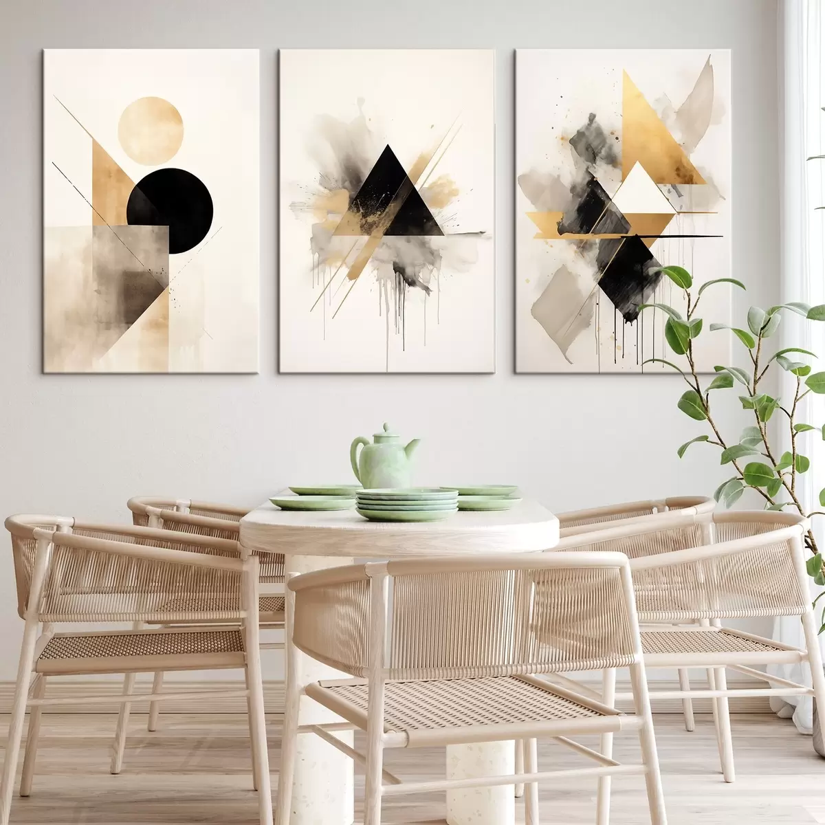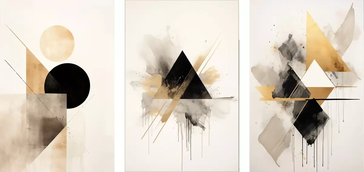 Schilderij Geometrische driehoeken met inktvlekken, zwart en oker Art. m00963