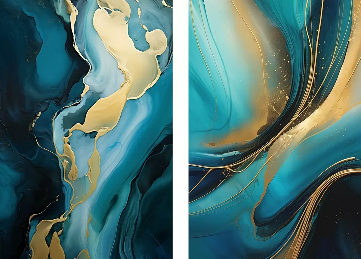 Schilderijen Teal vloeibaar abstract met warme metallic stromen m00965