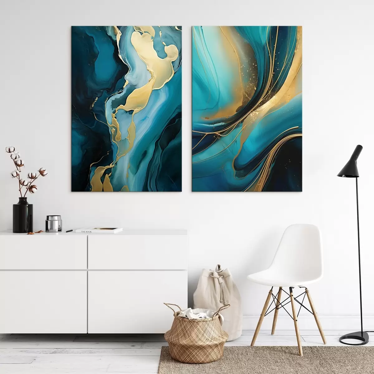 Schilderij Teal vloeibaar abstract met warme metallic stromen Art. m00965
