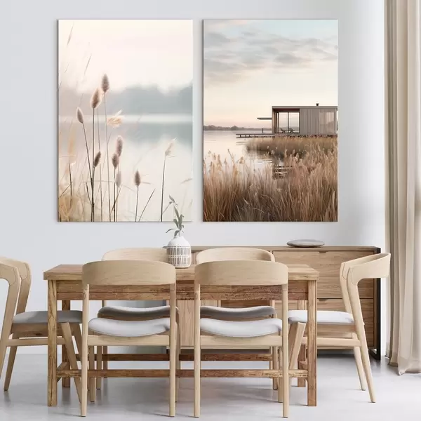Schilderij Zachte rietkragen aan een rustig meer en een moderne hut aan de oever Art. m00970