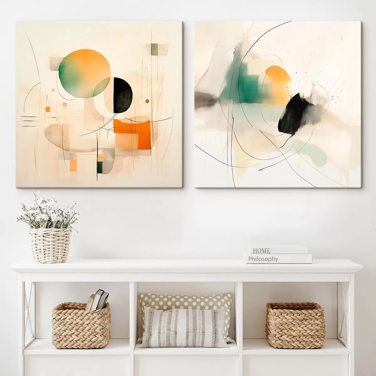 Schilderij Abstract tweeluik met cirkelvormige vormen en dynamische lijnen Art. m00981