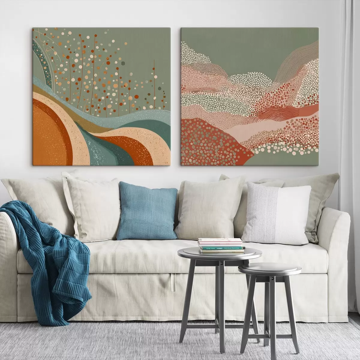 Schilderijen Tweedelig abstract landschap met gestippelde en golvende elementen m00987