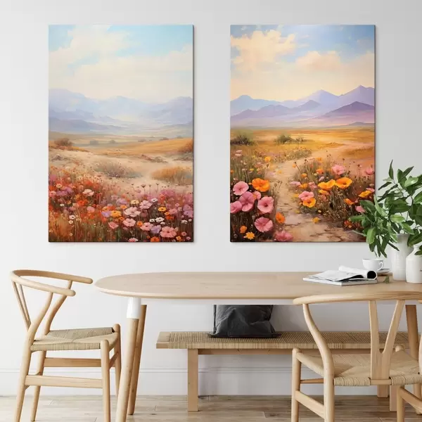 Schilderijen Landschap, een veld met kleurrijke bloemen en bergen op de achtergrond, zachte pastelkleuren m01003