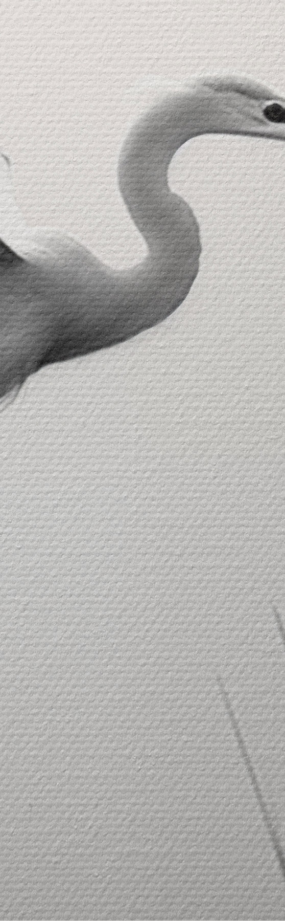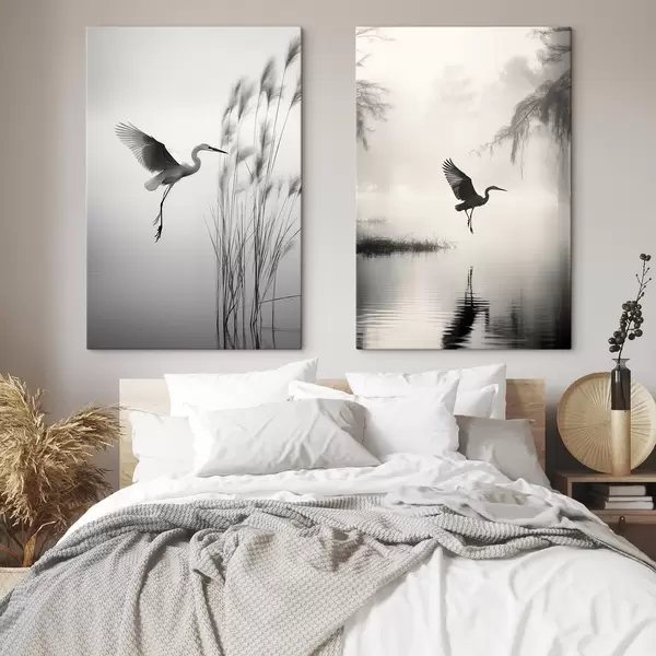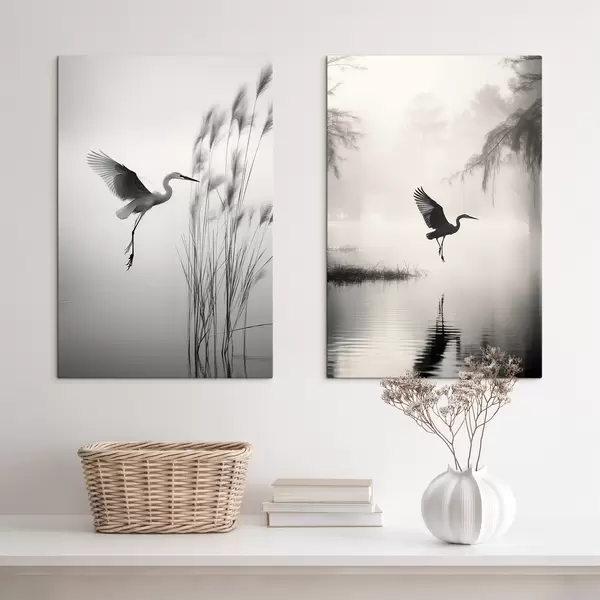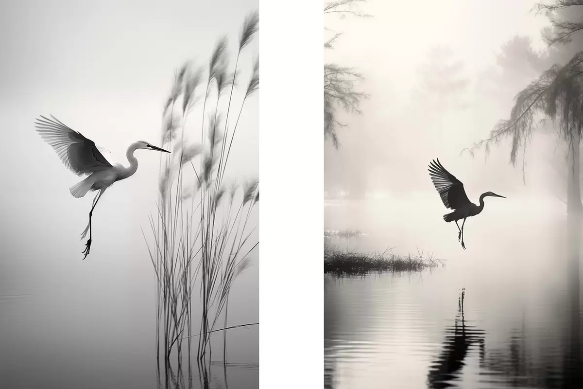 Schilderij Een witte reiger met gespreide vleugels, vliegend in de buurt van hoog riet, zwart-witte minimalistische compositie Art. m01007