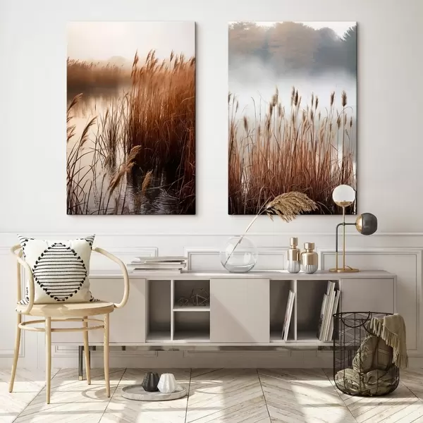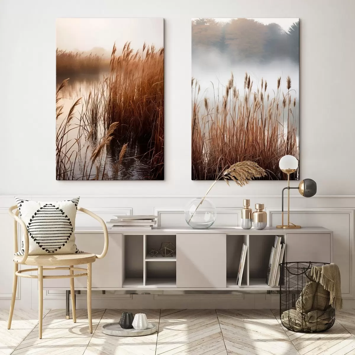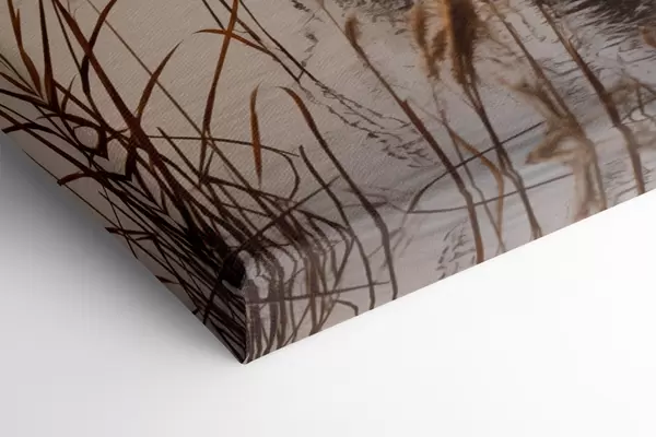 Schilderij Hoge rietstengels groeien in een watermassa, het water weerspiegelt het riet, mistige achtergrond, zacht licht, natuurtafereel Art. m01008