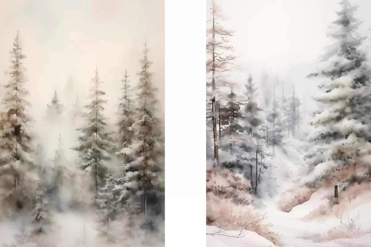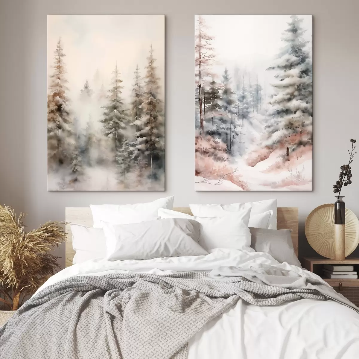 Schilderij Hoge dennenbomen bedekt met sneeuw, staande in een mistig bos, een zacht, gedempt winters tafereel Art. m01011