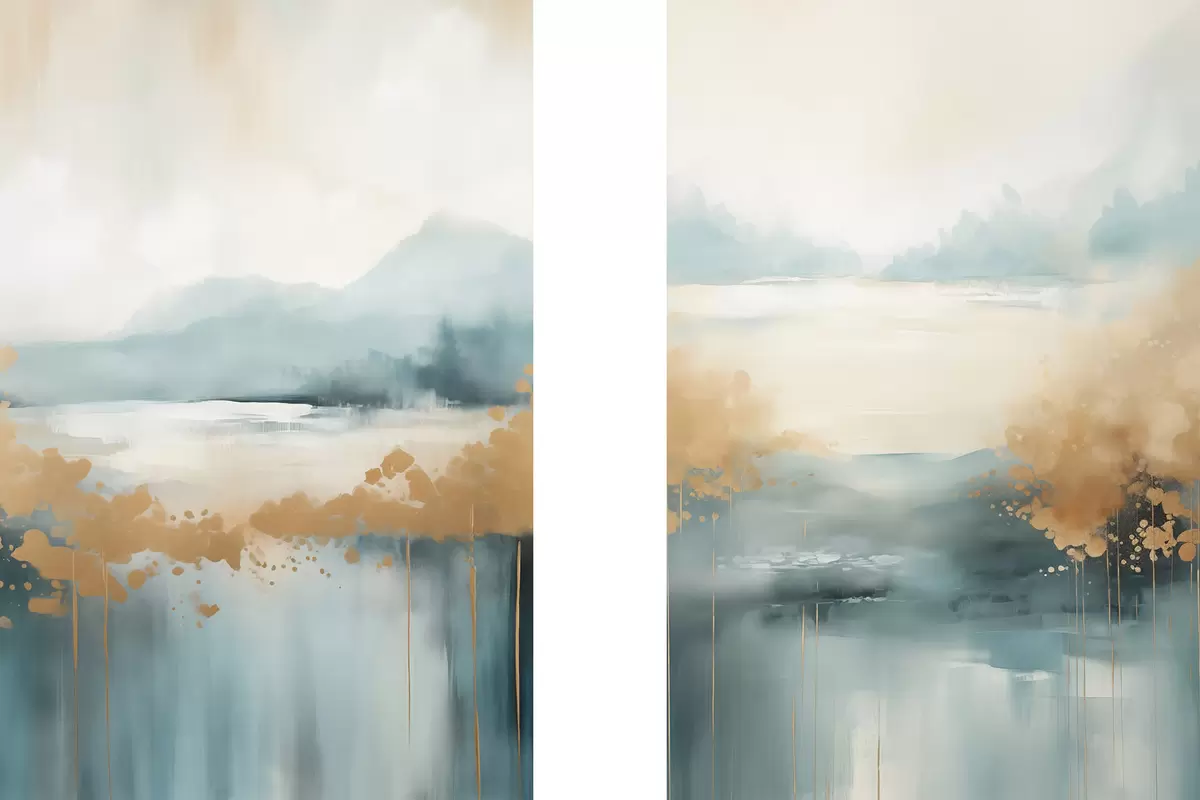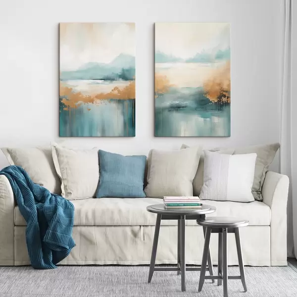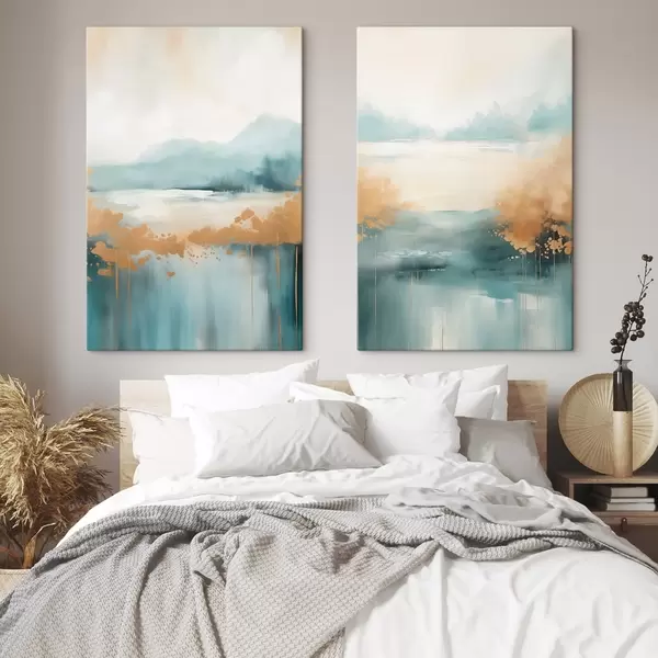 Schilderijen Abstract landschap met bergen en meer in blauwgroen en gestructureerd geel, zachte penseelstreken, minimalistisch kunstwerk m01012